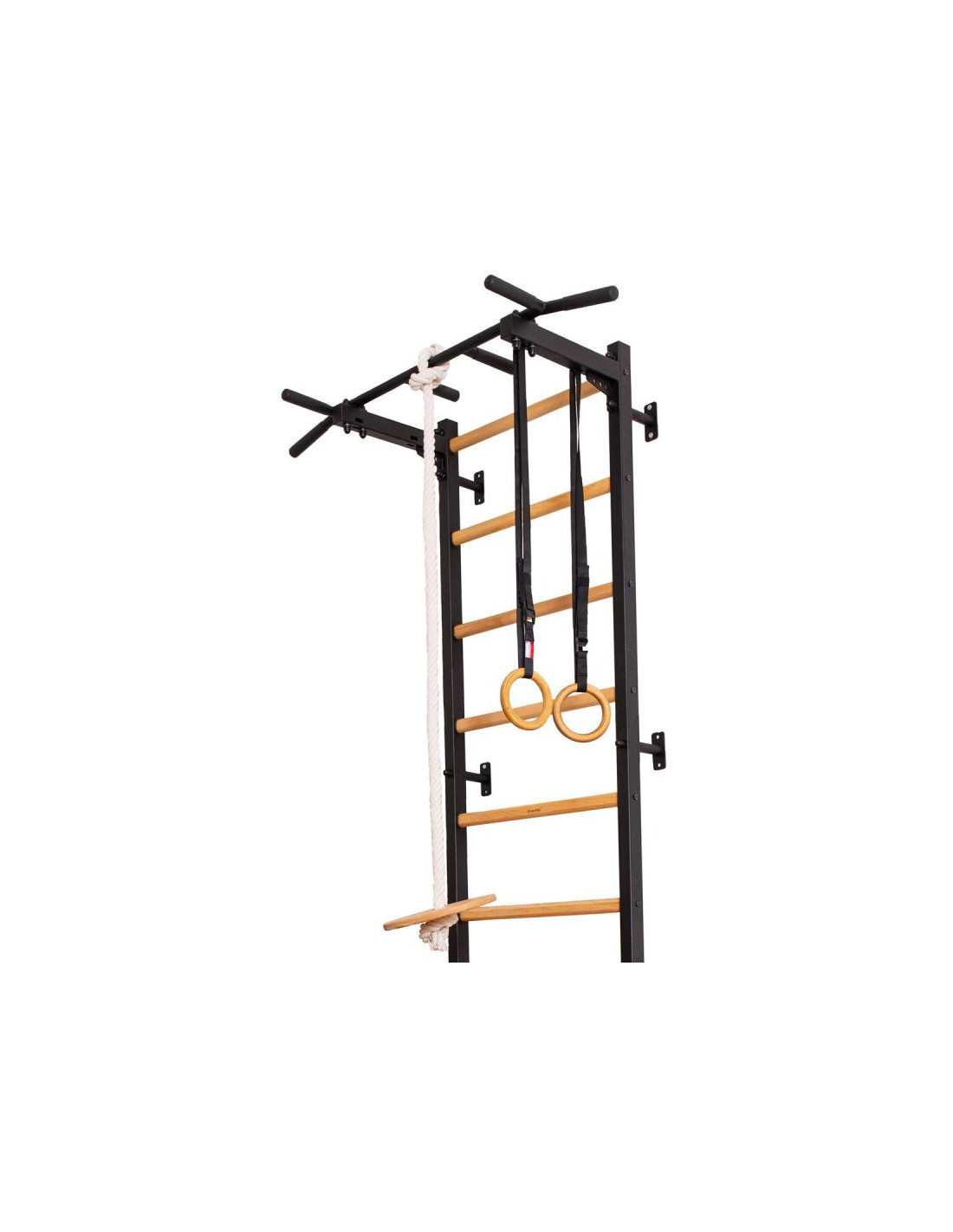 Pionowe profile (50 mm x 40 mm) drabinki są wykonane z wysokiej jakości, malowanego proszkowo metalu. Szczebelki zrobione są z bukowego drewna o owalnym kształcie, ich powierzchnia została ręcznie pomalowana olejem. Na górnej części drabinki znajduje się zamontowany na stałe metalowy drążek do podciągania. Drążek do podciągania posiada 6 rączek, które pozwalają wykonywać ćwiczenia ramion i pleców przy użyciu różnych chwytów. Długość drążka do podciągania to 115 cm.