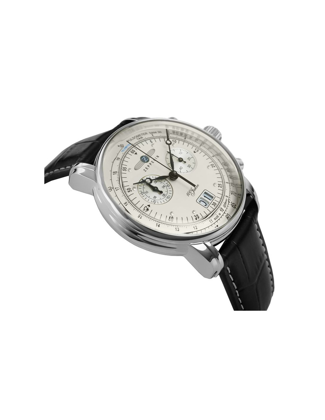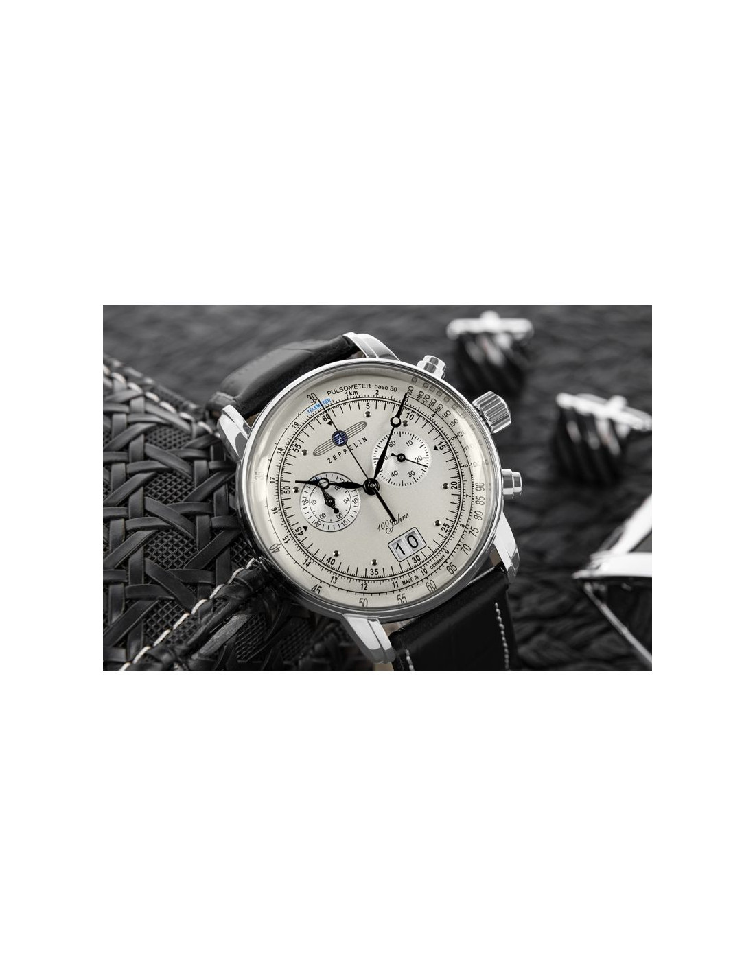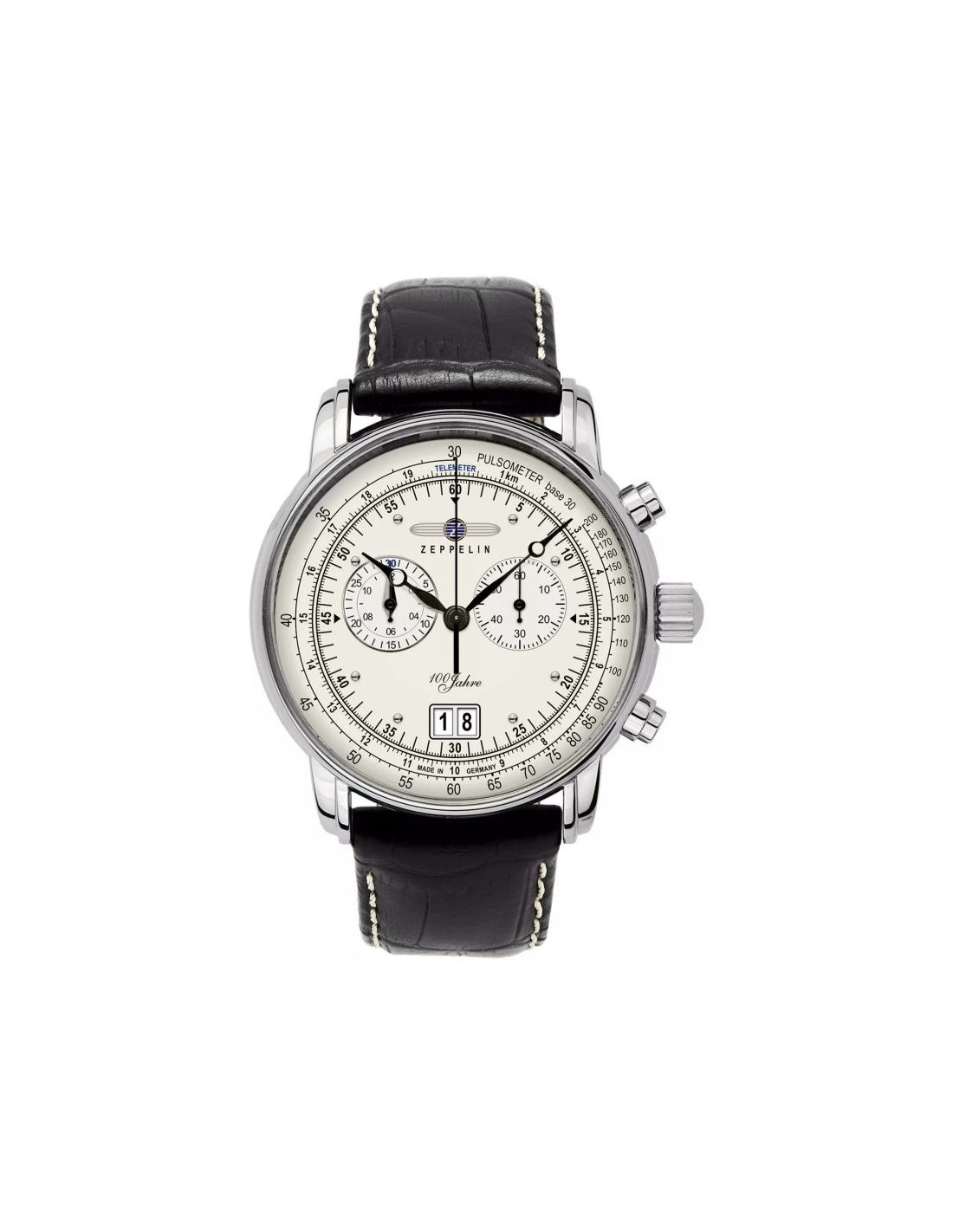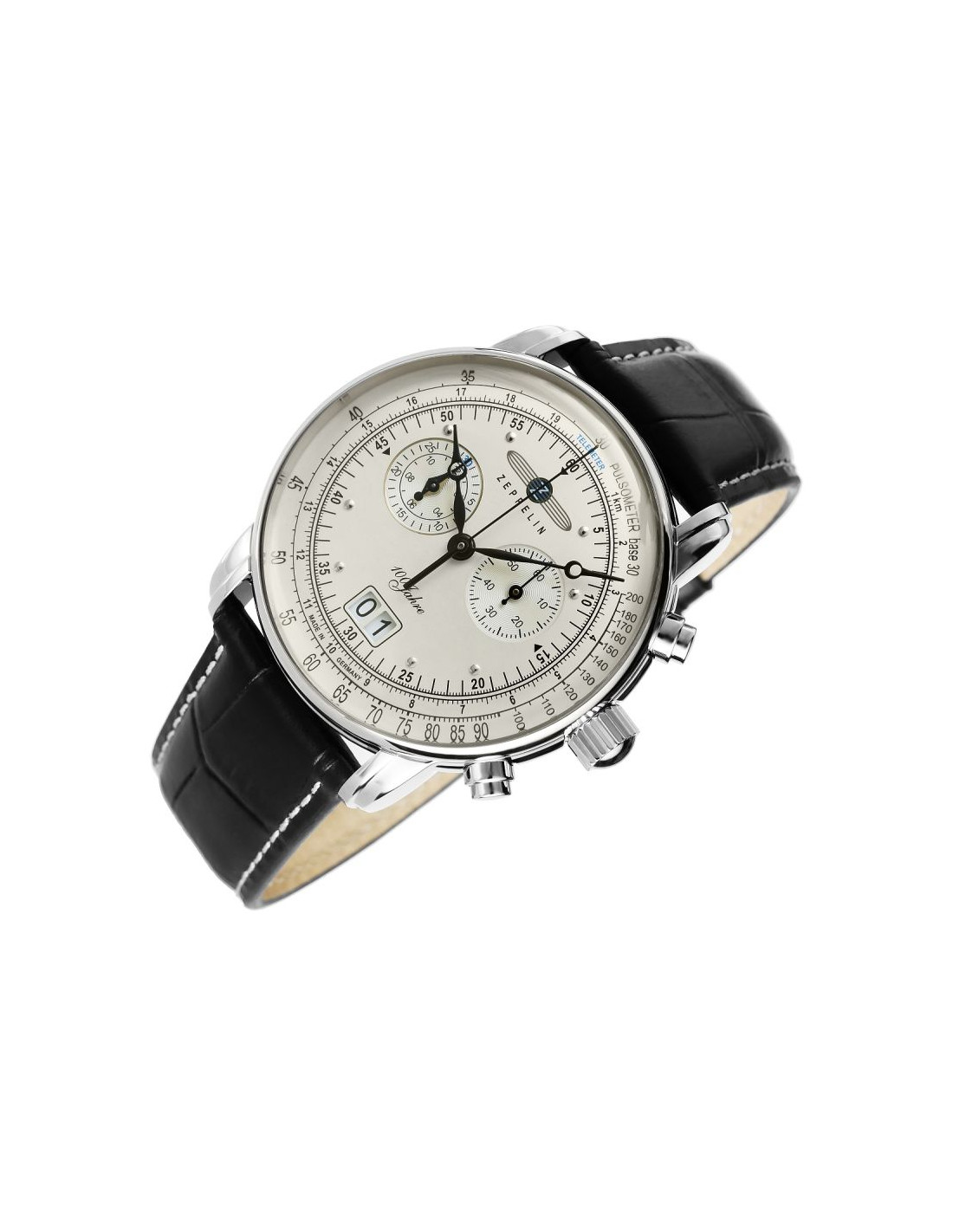Zegarek lotniczy 100 Jahre 7690-1 z limitowanej edycji powstałej, aby uczcić setną rocznicę istnienia legendarnej firmy Zeppelin. Ten czasomierz to precyzyjne narzędzie pomiarowe wyposażone w funkcje takie jak chronograf, pulsometr, datownik oraz telemetr do mierzenia odległości na podstawie różnicy czasu między zjawiskami. Wyraziste czarne wskazówki i indeksy na subtelnej tarczy zapewniają doskonałą czytelność, a srebrna koperta i czarny pasek z brązowym przeszyciem podkreślają jego lotniczy styl.