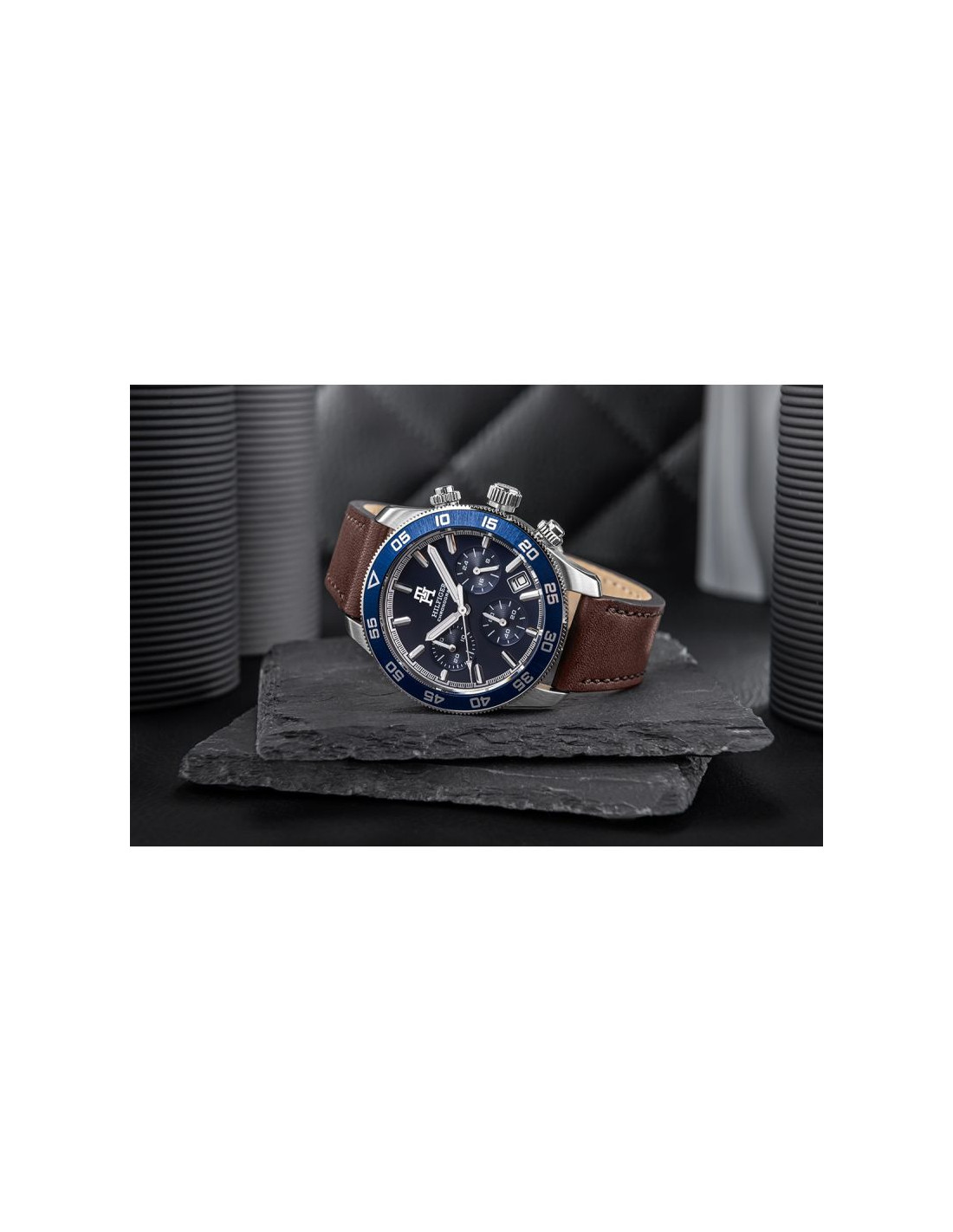 Na tarczy zegarka znajdują się oznaczenia rozbudowanego wskazania daty - dzień miesiąca, dzień tygodnia i czas w systemie 24godzinnym. Chronografy nie tylko wzbogacają funkcjonalność, ale także znacząco zwiększają prestiż tego modelu. Chronograf to jeden z najbardziej pożądanych elementów w zegarkach premium, a jego obecność świadczy o skomplikowanej mechanice i precyzji wykonania.