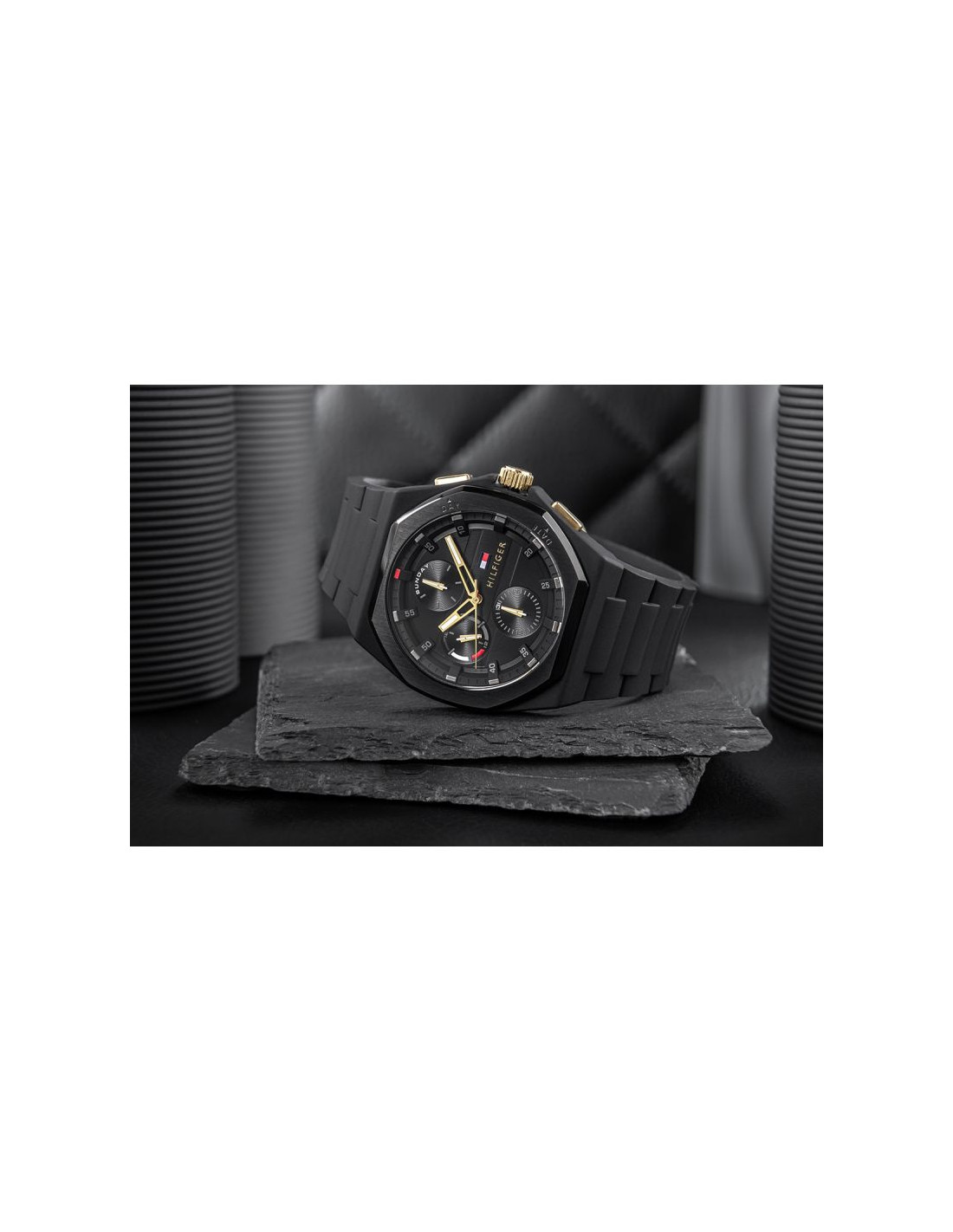 Matowa czerń koperty i paska w idealnej harmonii z luksusowymi, złotymi akcentami na wskazówkach i koronce tworzy elegancję o futurystycznym zacięciu. Charakterystyczny bezel w kształcie dziesięciokąta przełamuje klasykę, nadając zegarkowi unikalnego i dynamicznego wyrazu, a trójwymiarowa tarcza z delikatną fakturą hipnotyzuje swoją głębią. Ucięte wskazówki i subtelne kolorowe detale na subtarczy dopełniają całości, czyniąc ten model prawdziwym manifestem nowoczesnego męskiego stylu i niepowtarzalności. Całość tworzy niepowtarzalne połączenie nowoczesności, precyzji i charakteru – zegarek, który staje się częścią Twojej osobowości.