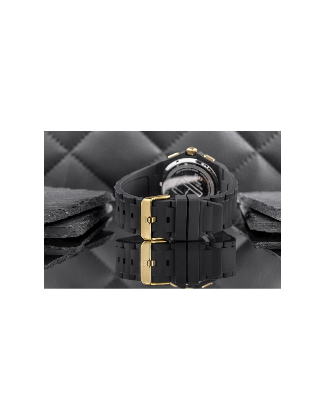 Zegarek, który łączy surową elegancję z odważnym, futurystycznym designem – idealny dla mężczyzny, który lubi się wyróżniać. Intensywna czerń emanuje charakterem i aurą tajemniczości, a szczotkowane wykończenie dziesięciokątnego bezela nadaje zegarkowi surowego, industrialnego charakteru. Całość dopełnia rójwymiarowa tarcza z luksusowymi złotymi akcentami, złota koronka oraz złota sprzączka.