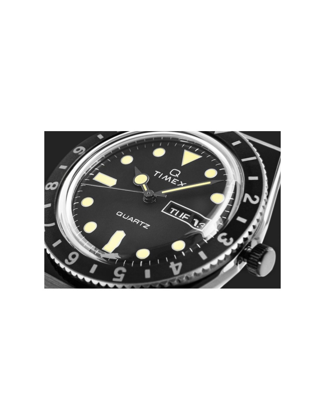 Czarna tarcza zegarka została wykończona w stylu „sunburst”, który pięknie odbija światło, nadając głębi kolorowi. Wyposażona jest w wyraźne, luminescencyjne indeksy i wskazówki, zapewniające doskonałą czytelność nawet w ciemności. Zamiast cyfr zastosowano geometryczne markery – koła i prostokąty – które przywołują stylistykę nurkowych modeli sprzed dekad.