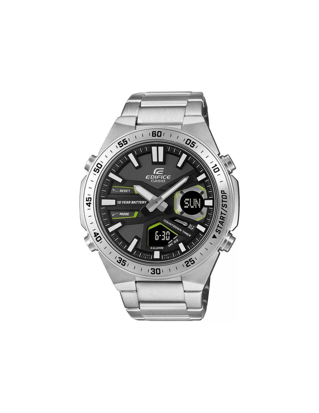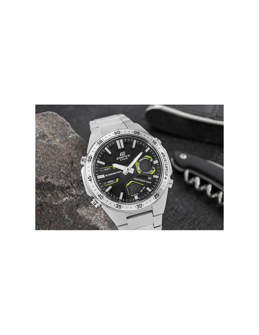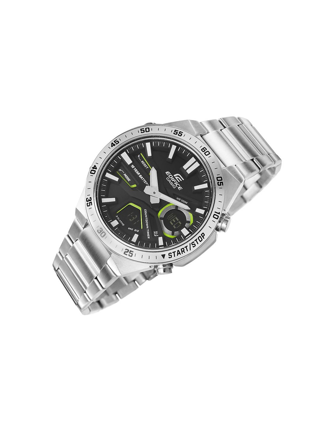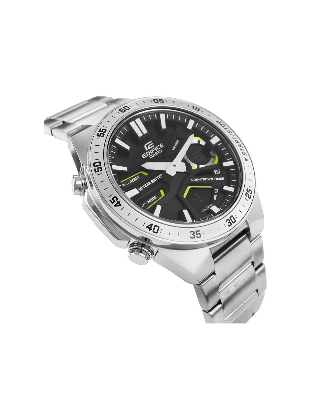 Wszechstronny zegarek dla aktywnych i wymagających. Analogowo-cyfrowy czasomierz EDIFICE EFV-C110 zapewnia precyzję i funkcjonalność na lata – 10-letnia bateria sprawia, że możesz zapomnieć o jej wymianie na długi czas. Dynamiczny, sportowy design podkreśla głębia i trójwymiarowość tarczy, a cyfrowe wyświetlacze oferują szeroki wachlarz funkcji, w tym czas światowy, stoper 1/100 sekundy i minutnik odliczający. Model posiada równieżTelememo z możliwością zapisania 30 numerów telefonów, zawierających do 12 cyfr z nazwą do 8 znaków. Skup się na życiu i wybierz EDIFICE EFV-C110 - zegarek, który Cię nie zawiedzie.