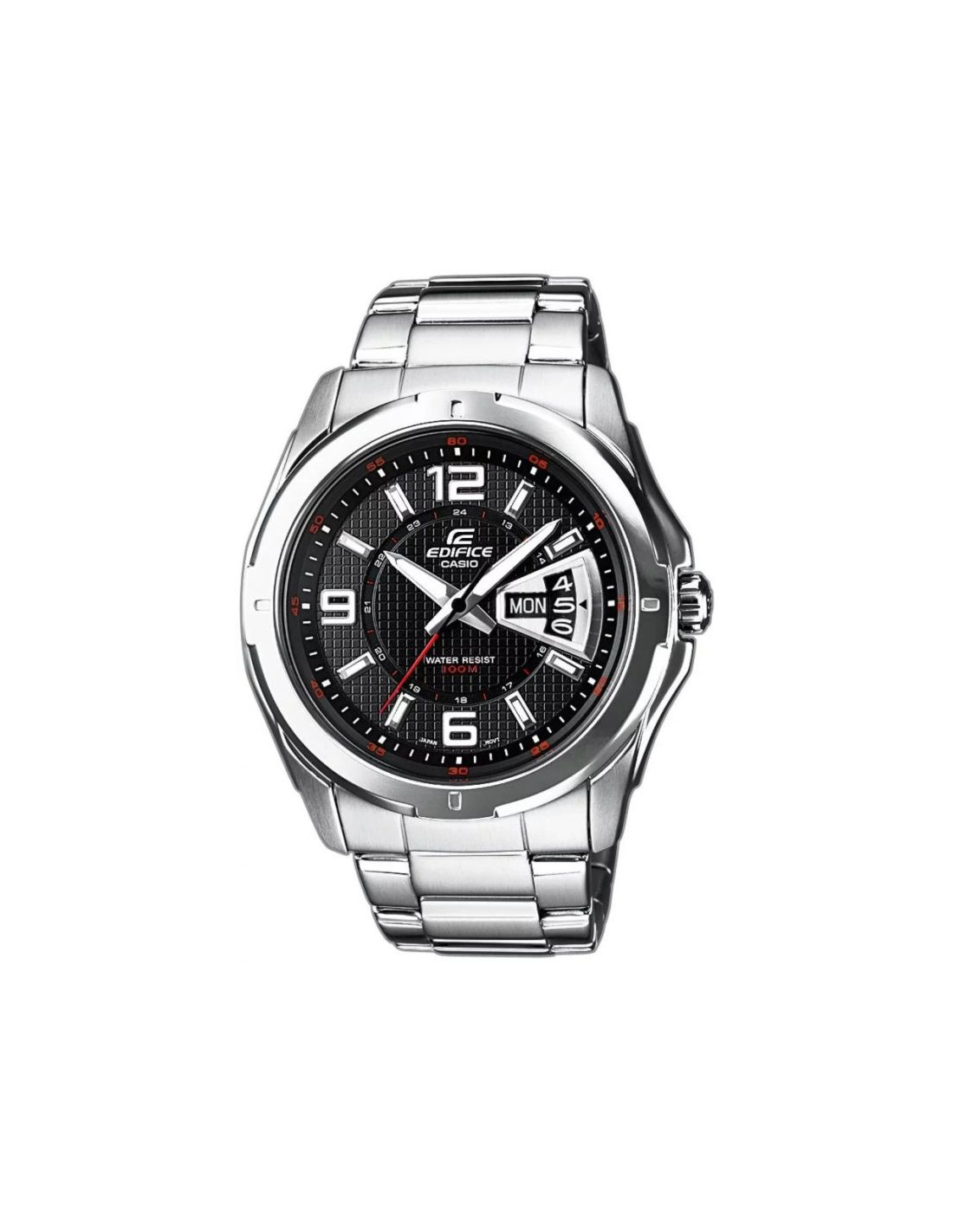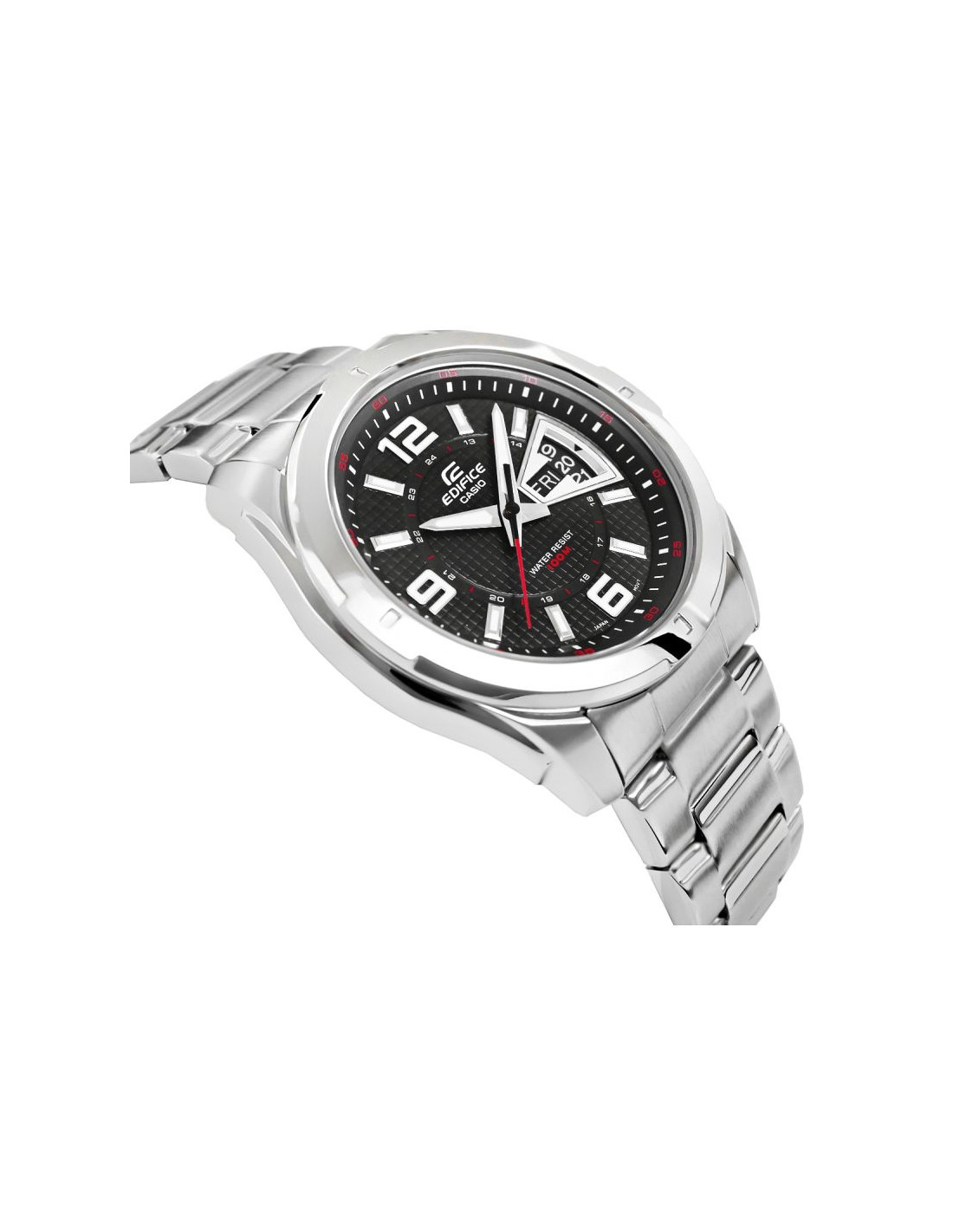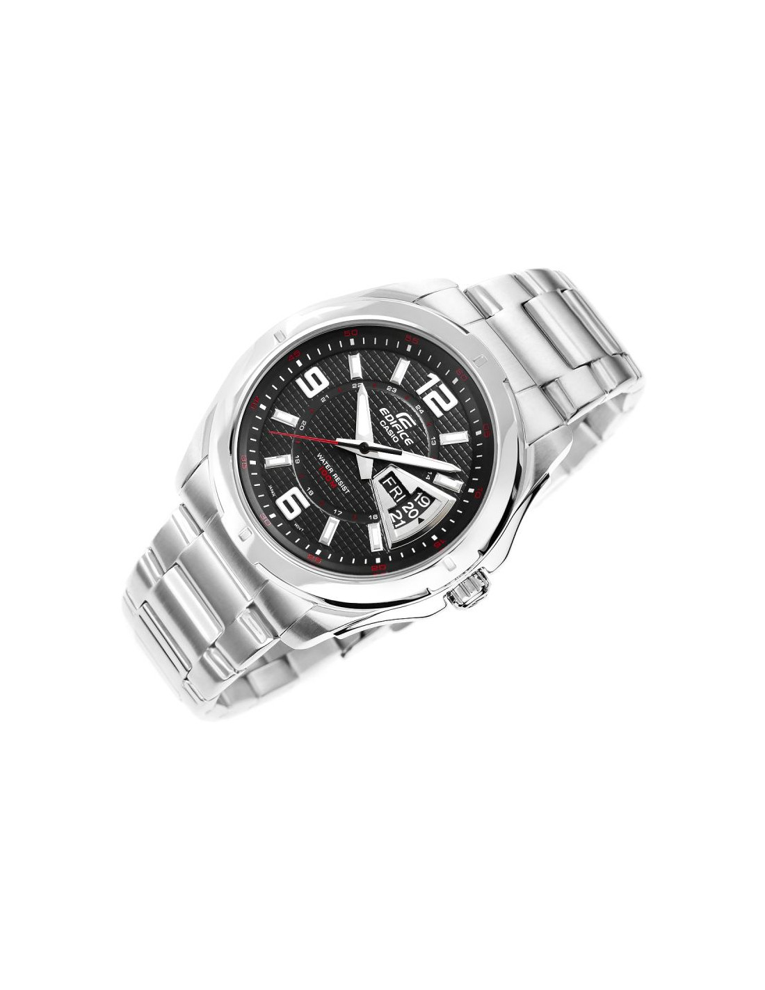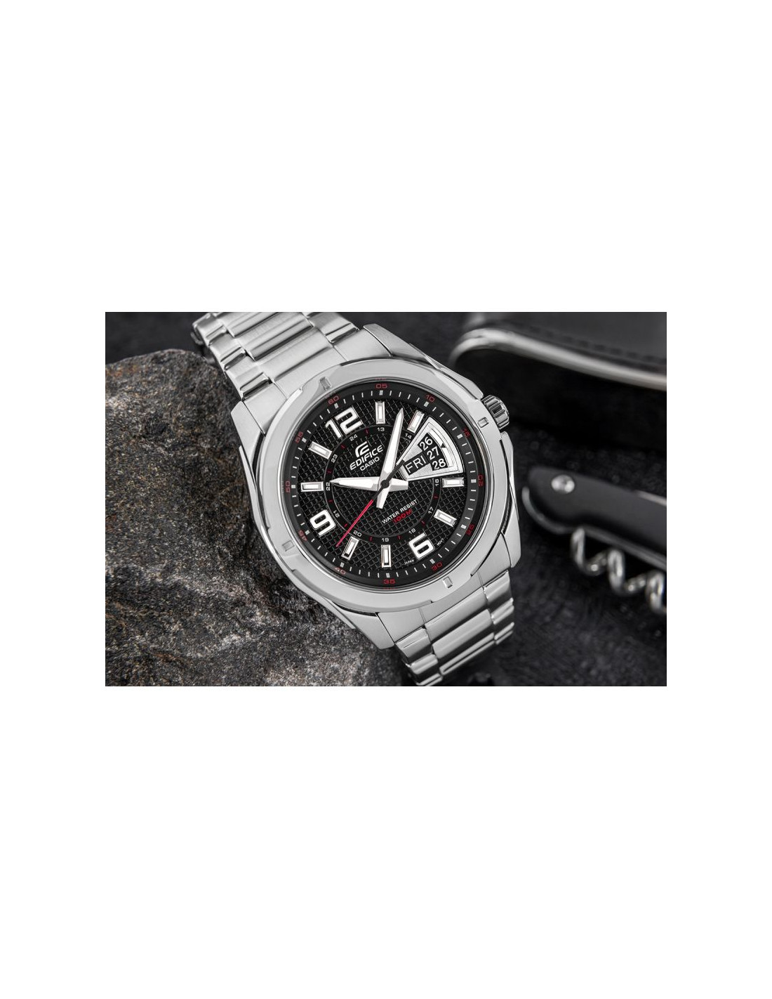 Wybierając ten model CASIO EDIFICE zyskujesz topowy zegarek męski, który spełnia najwyższe oczekiwania. Nowoczesny układ z karbowaną czarną tarczą uzupełnioną o datownik i czerwone detale podkreśla dynamiczny charakter zegarka, łącząc funkcjonalność z unikalnym designem. Wodoszczelność 10 BAR pozwala na swobodę w wodzie, a fluorescencyjne podświetlenie gwarantuje widoczność nawet po zmroku. Logo EDIFICE wytłoczone na koronce, deklu i zapięciu.