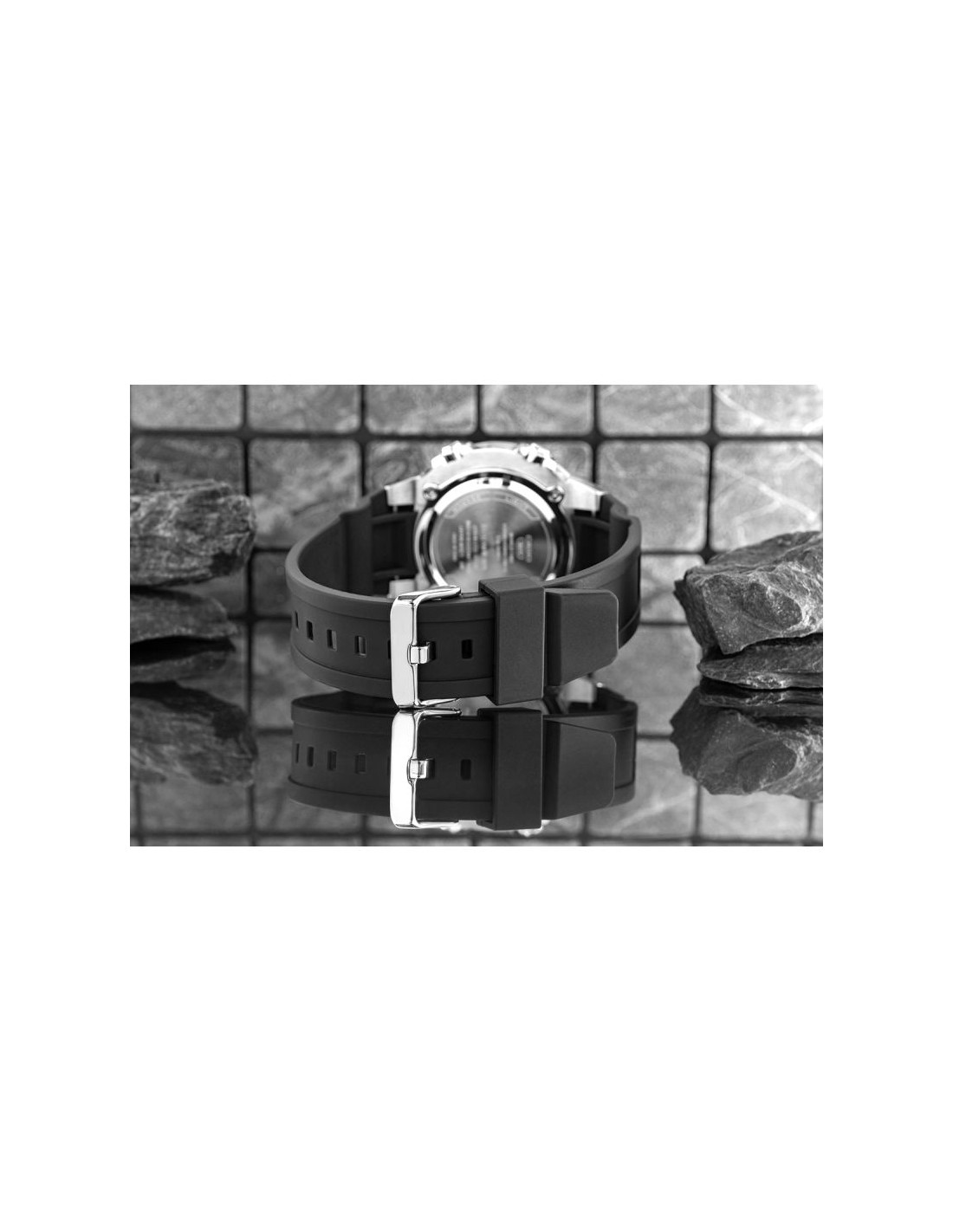 Połączenie analogowych wskazówek z cyfrowym wyświetlaczem zostało osadzone głęboko w strukturze tarczy, co w połączeniu z warstwową konstrukcją tworzy dynamiczny, techniczny efekt. Całość dopełnia lekko wypukłe szkiełko, które nie tylko dodaje głębi kompozycji, ale również podkreśla solidność i styl zegarka. To zestawienie podkreśla głębię i precyzję wykonania przy każdym ruchu nadgarstka.