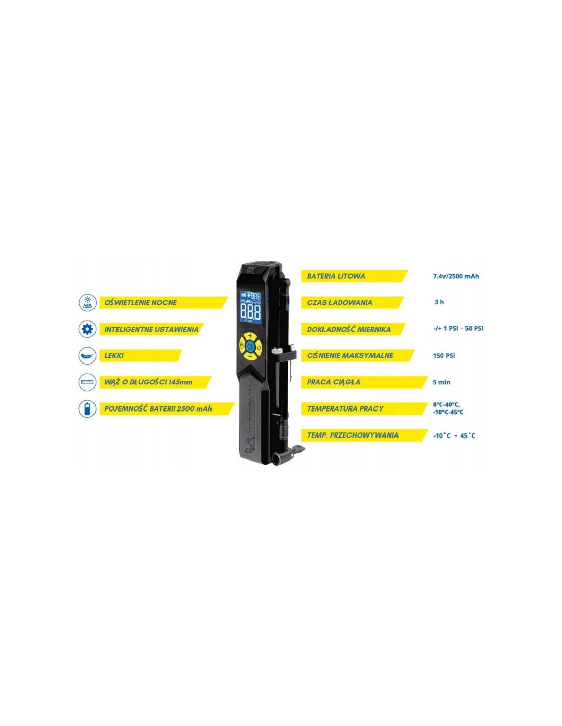Niska waga i ergonomiczna obudowa urządzenia sprawiają, że sprawdzi się nie tylko przy pompowaniu kół samochodu ale też posłuży rowerzystom, czy motocyklistom. Dodatkowo w każdej chwili skontrolujesz stan ciśnienia w oponach swojego pojazdu - w ciągu kilku sekund z dokładnością +/- 1 PSI.