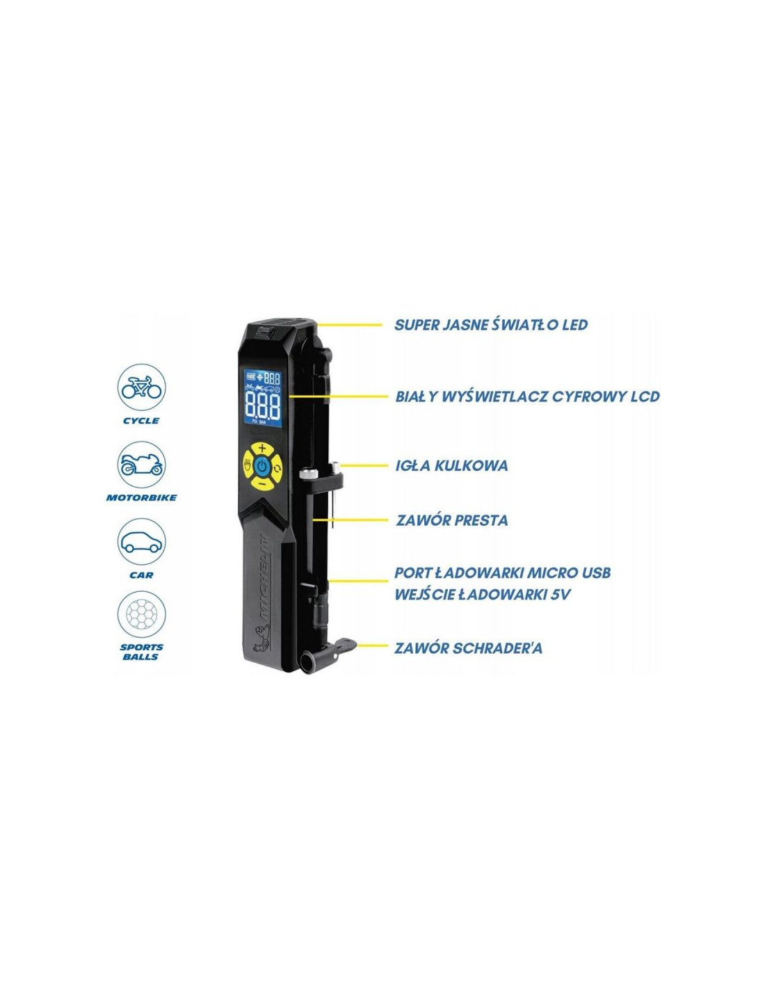 - wyposażona w dodatkowe adaptery- zawór Schrader'a, zawór Presta, igła kulkowa