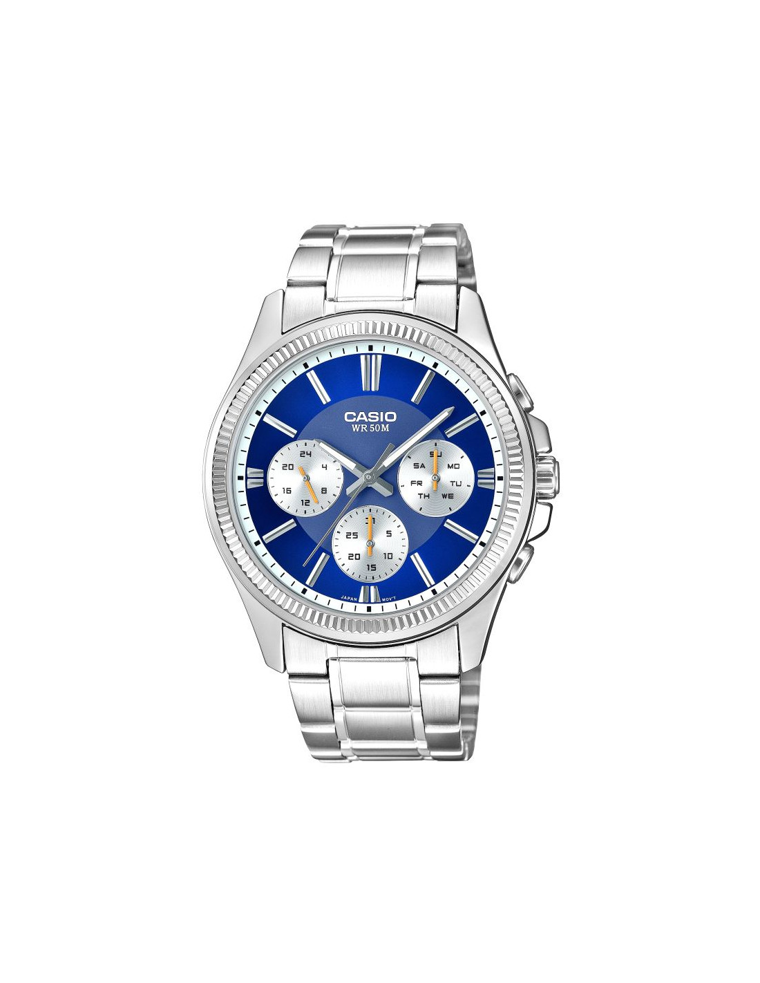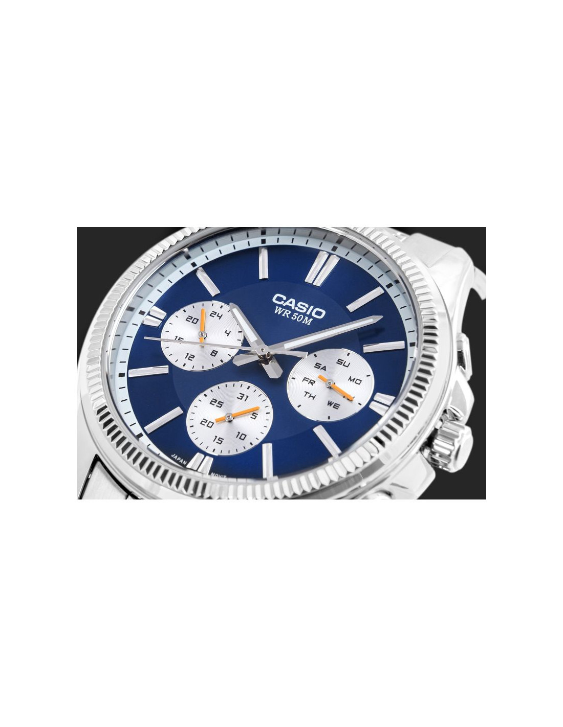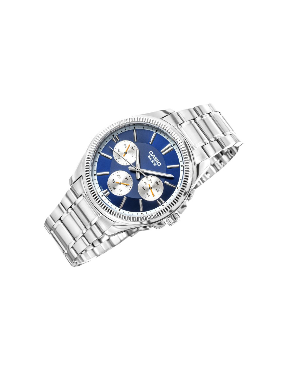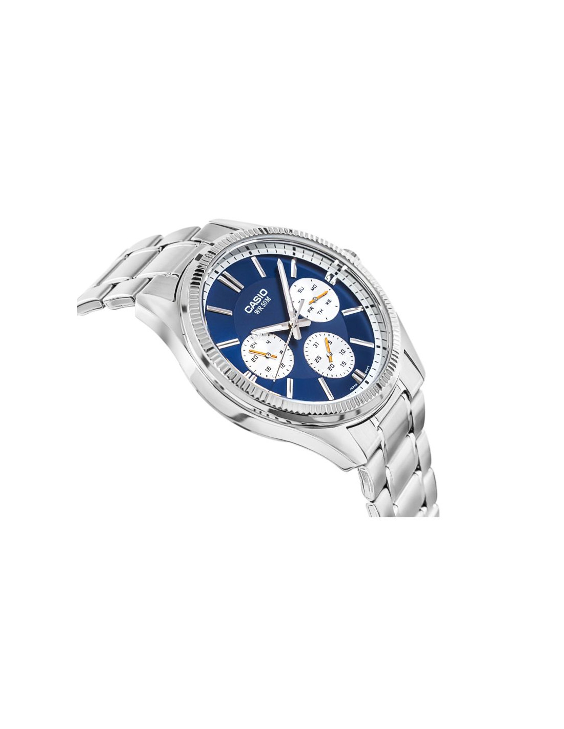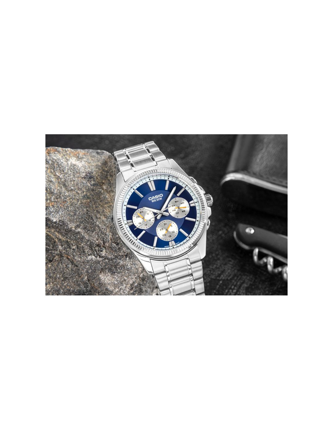 CASIO MTP-1375D-2A1VDF toklasyczny, analogowy zegarek w metalowej oprawie, wzbogacony tarczą w kolorze granatowym. Klasyczna stalowa konstrukcja z powłoką jonową gwarantuje trwałość i odporność na codzienne wyzwania, a eleganckie srebrne detale dodają charakteru każdej stylizacji – od garnituru po jeansy. Subtarcze pokazujące dzień tygodnia, datę i godzinę w trybie 24h dają Ci pełen obraz sytuacji za jednym spojrzeniem, bez sięgania po telefon. Wodoszczelność do 50 metrów i dokładność mechanizmu (±20 sekund/miesiąc) to spokój ducha – nie musisz się martwić o pogodę, przypadkowe zachlapania czy spóźnienia. Całość tworzy wyrazisty, męski styl, który przyciąga spojrzenia i sprawia, że zegarek prezentuje się znacznie powyżej swojej klasy cenowej.