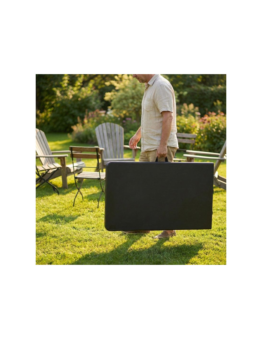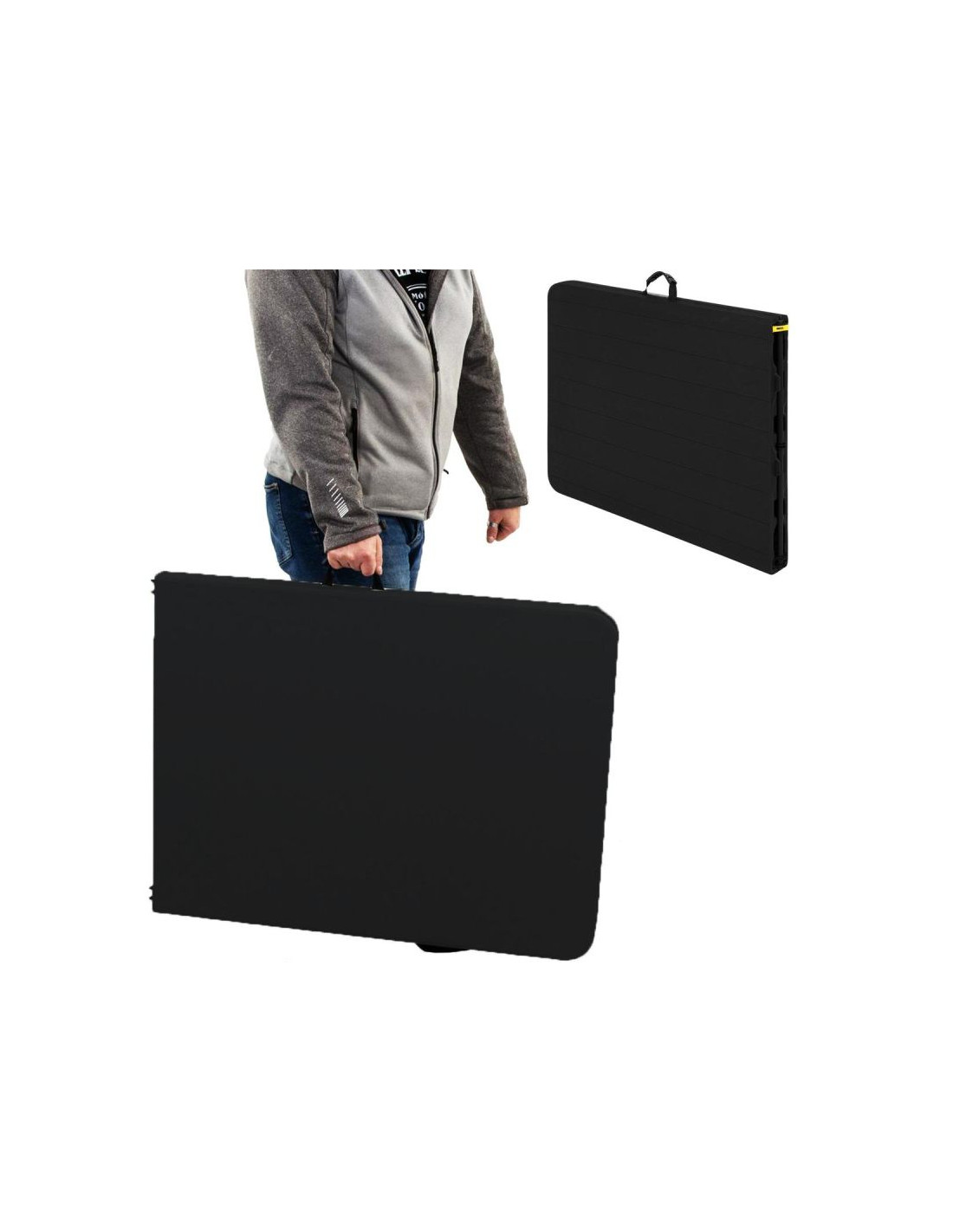 Po złożeniu stół przybiera formę poręcznej walizki z uchwytem. To idealne rozwiązanie do szybkiego transportu i przechowywania w małych przestrzeniach, takich jak bagażnik auta czy schowek.