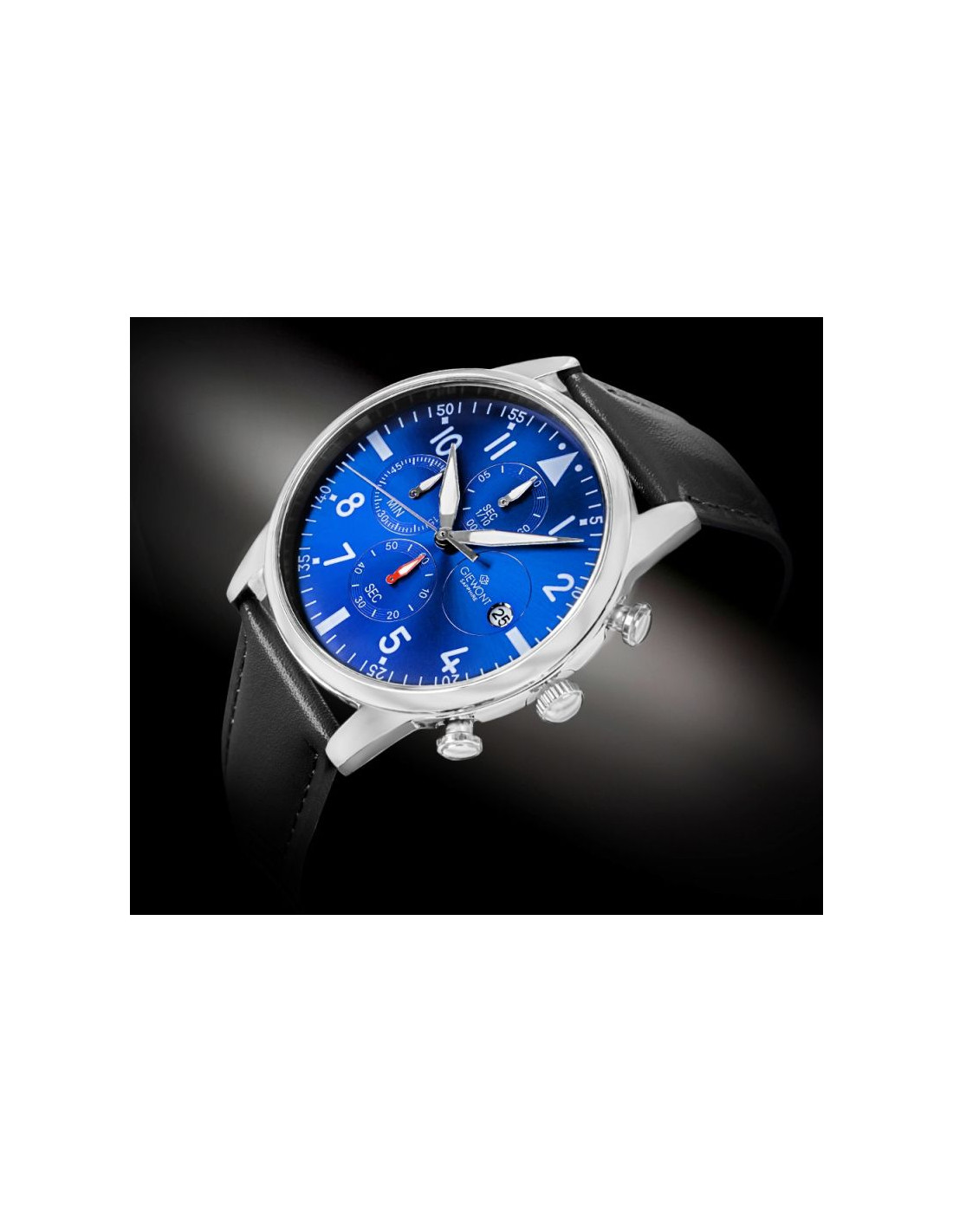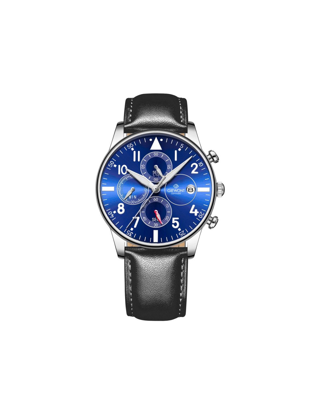 Zegarek Męski Giewont GW5630-A3 to wyjątkowe połączenie lotniczej stylistyki, funkcjonalności oraz zdecydowanego, męskiego charakteru — model stworzony dla osób ceniących wyrazisty design i pełną czytelność w każdych warunkach. Jego tarcza przyciąga uwagę dużymi, kontrastowymi cyframi arabskimi oraz charakterystycznym trójkątnym znacznikiem na godzinie 12, które nadają zegarkowi autentyczny, pilotowy charakter. Trzy precyzyjne subtarcze oferują funkcje chronografu, takie jak pomiar minut, sekund oraz 1/10 sekundy, dodając mu sportowego temperamentu i technicznej głębi. Wytrzymałe szkiełko szafirowe skutecznie chroni tarczę przed zarysowaniami, gwarantując zachowanie idealnego wyglądu przez długi czas, nawet przy intensywnym użytkowaniu. Koperta o eleganckim wykończeniu doskonale komponuje się z miękkim, skórzanym paskiem, który zapewnia komfort i świetne dopasowanie do nadgarstka. Funkcjonalność modelu podkreśla również praktyczny datownik na godzinie 3, zwiększający jego codzienną użyteczność. Zegarek Giewont GW5630-A3 to model dla mężczyzny pewnego siebie, świadomego stylu i ceniącego detale — zegarek, który wyróżnia się z daleka, a z bliska zachwyca głębią i ponadczasową elegancją.