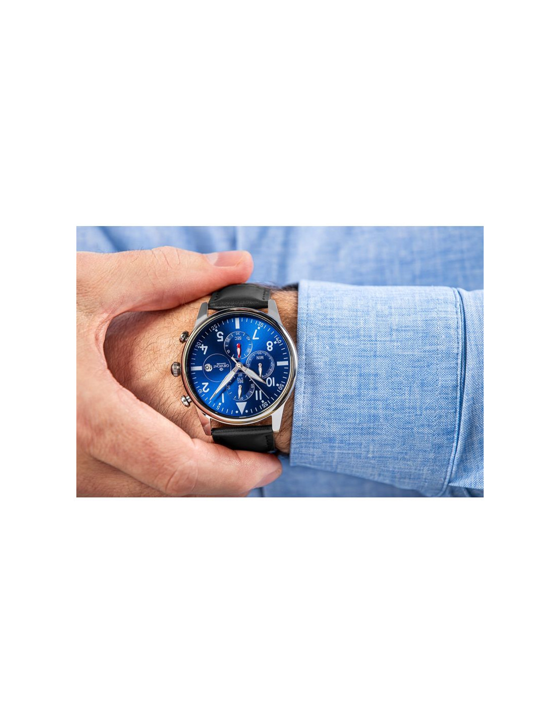 Koperta prezentuje się nowocześnie i wyraziście, zachowując przy tym elegancką linię i solidną konstrukcję. Idealnie współgra z wysokiej jakości skórzanym paskiem, którego gładka faktura i staranne przeszycia podkreślają klasę czasomierza, zapewniając jednocześnie wygodne dopasowanie do nadgarstka. Proporcje tarczy, geometryczne akcenty i wyraziste wskazówki tworzą harmonijną całość, nadając modelowi przejrzystości, głębi i ponadczasowego stylu.