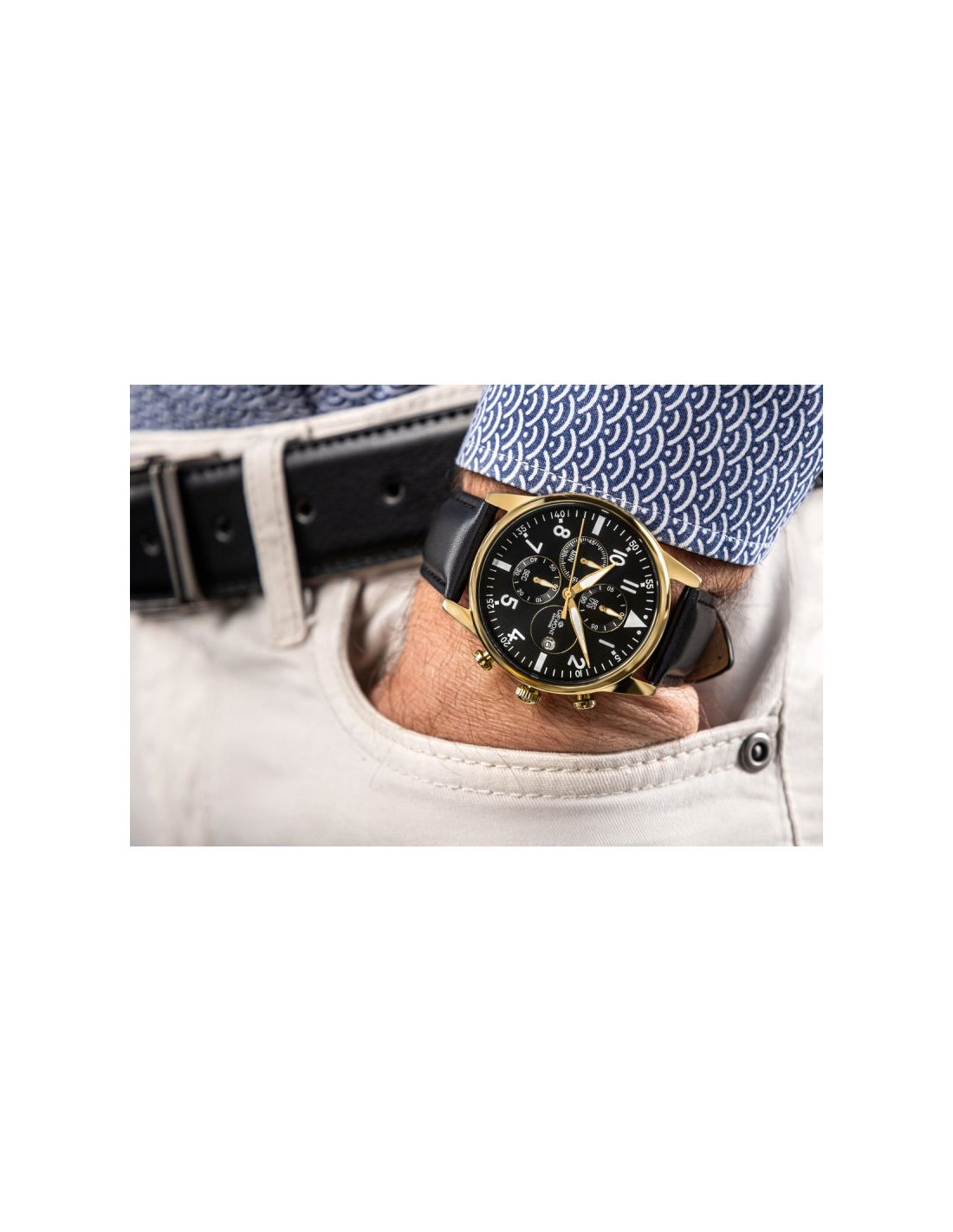 Koperta prezentuje się nowocześnie i wyraziście, zachowując przy tym elegancką linię i solidną konstrukcję. Idealnie współgra z wysokiej jakości skórzanym paskiem, którego gładka faktura i staranne przeszycia podkreślają klasę czasomierza, zapewniając jednocześnie wygodne dopasowanie do nadgarstka. Proporcje tarczy, geometryczne akcenty i wyraziste wskazówki tworzą harmonijną całość, nadając modelowi przejrzystości, głębi i ponadczasowego stylu.