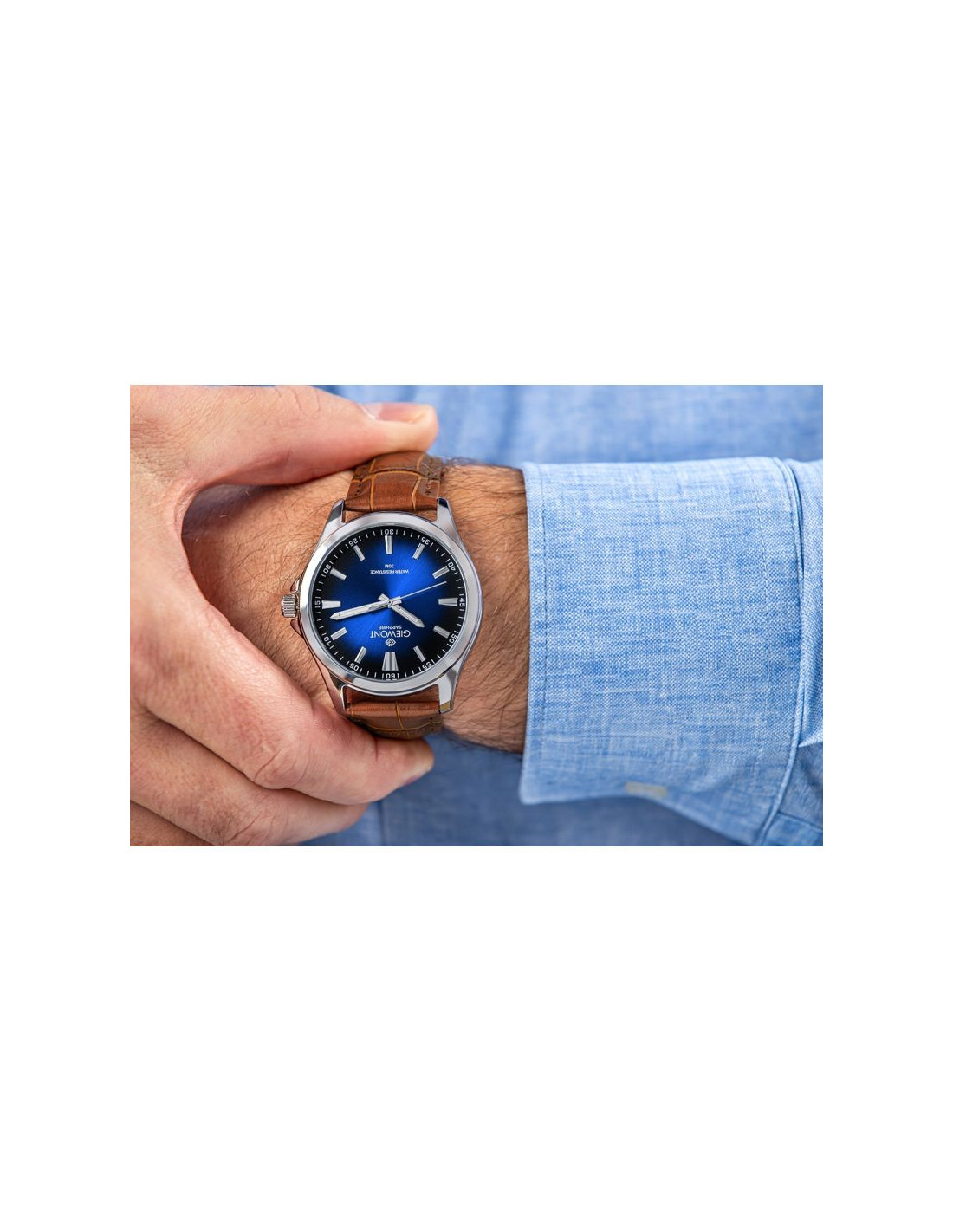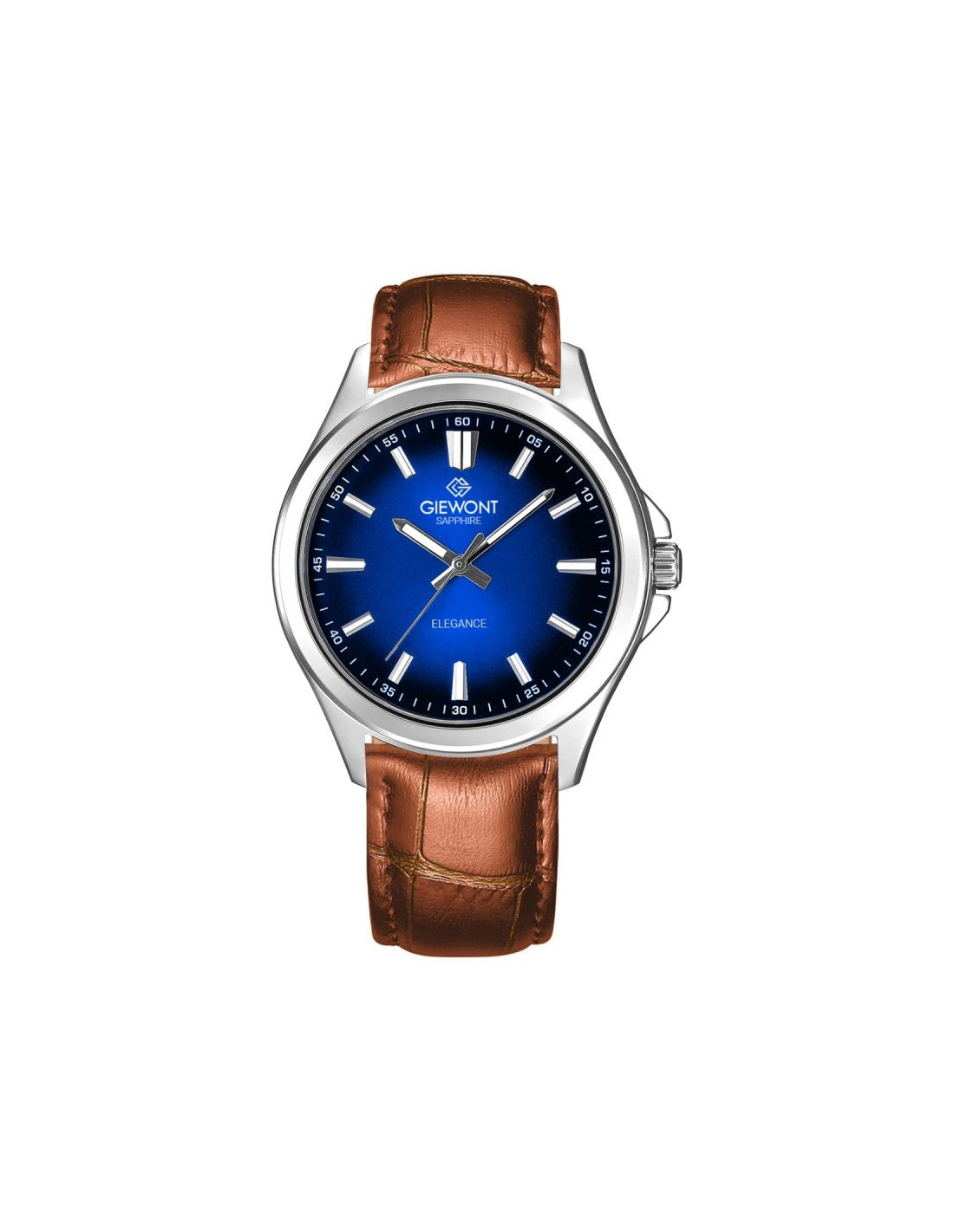 GIEWONT Elegance Sapphire to zegarek stworzony dla mężczyzn, którzy cenią sobie nienaganny styl, dobrą jakość wykonania i detale świadczące o dobrym guście. Jego głęboka, granatowa tarcza o subtelnym, promienistym gradiencie natychmiast przyciąga wzrok i nadaje całości wyjątkowego, prestiżowego charakteru, a odporne na zarysowania szafirowe szkło gwarantuje, że czasomierz zachowa swój nienaganny wygląd przez wiele lat intensywnego użytkowania. Precyzyjne, metaliczne indeksy i smukłe wskazówki zapewniają doskonałą czytelność nawet w trudnych warunkach oświetleniowych, podkreślając jednocześnie elegancki charakter zegarka. Solidna koperta w srebrnym połysku harmonijnie współgra z miękkim, klasycznym skórzanym paskiem, który idealnie dopasowuje się do nadgarstka i sprawia, że noszenie zegarka jest czystą przyjemnością. To uniwersalny, ponadczasowy model, który doskonale sprawdzi się zarówno podczas spotkań biznesowych, formalnych uroczystości, jak i w codziennych stylizacjach, dodając pewności siebie oraz wyrafinowania. GIEWONT Elegance Sapphire to nie tylko stylowy dodatek – to symbol elegancji, dbałości o detale i świadomy wybór mężczyzny, który wie, czego oczekuje od swojego czasu i od swojego stylu.