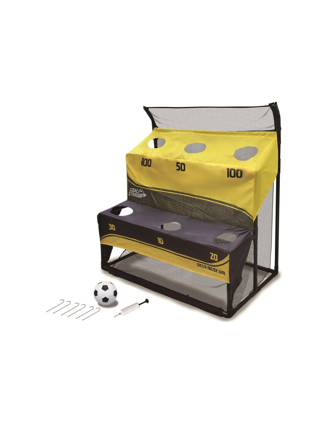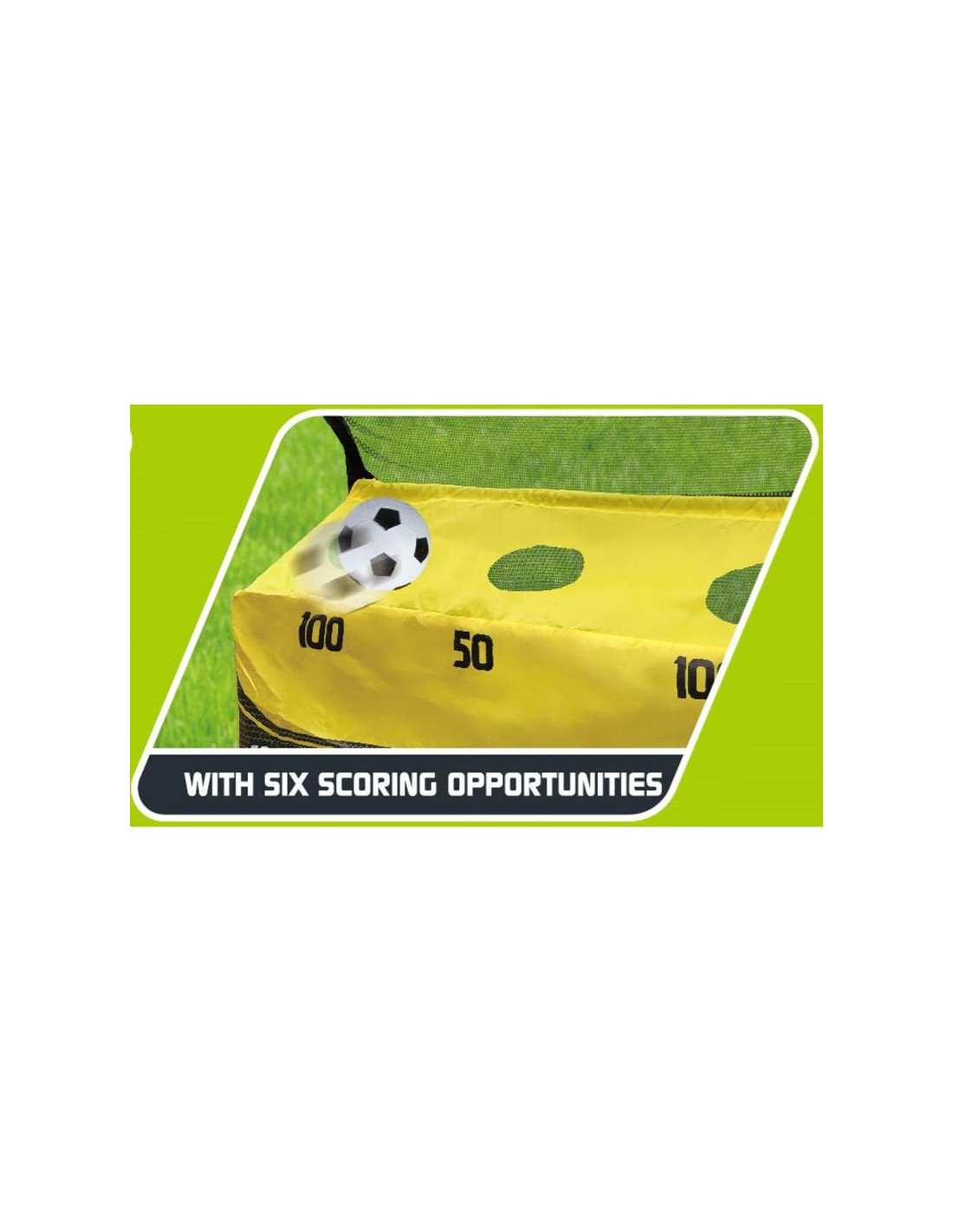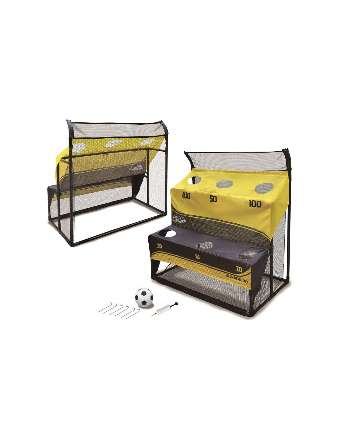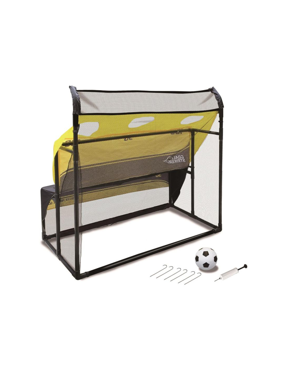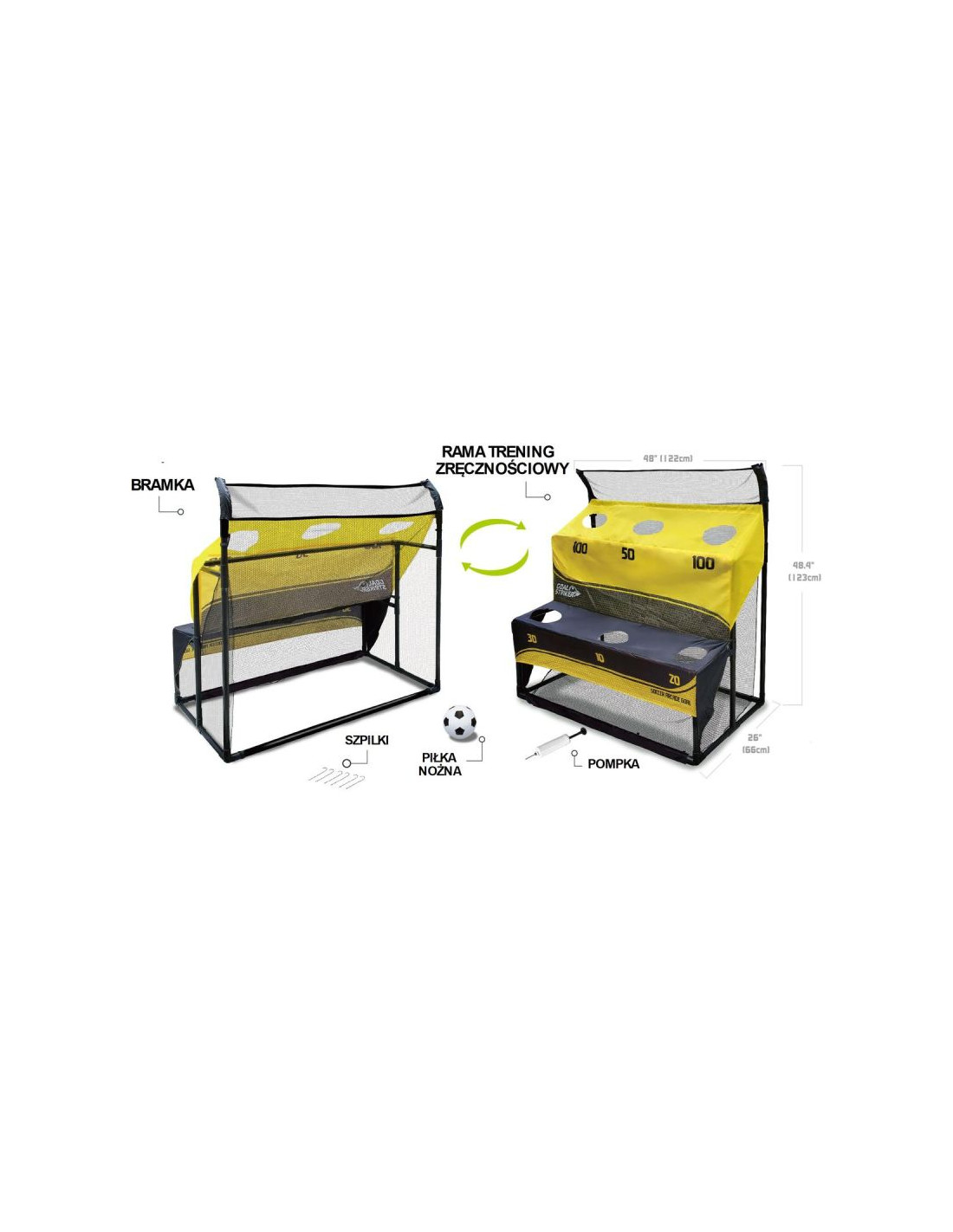 Zestaw ma dwie funkcje, z jednej strony może być zwykłą bramką do gry w piłkę nożną, z drugiej strony posiada tarcze strzeleckie na dwóch poziomach i wygiętą ramę górną, idealne do ćwiczenia celności.