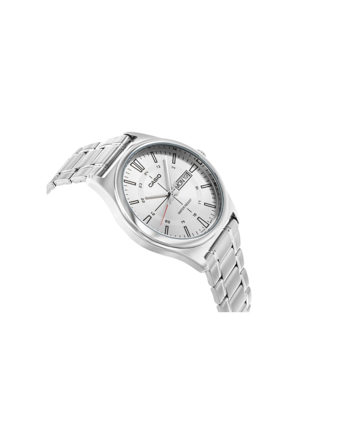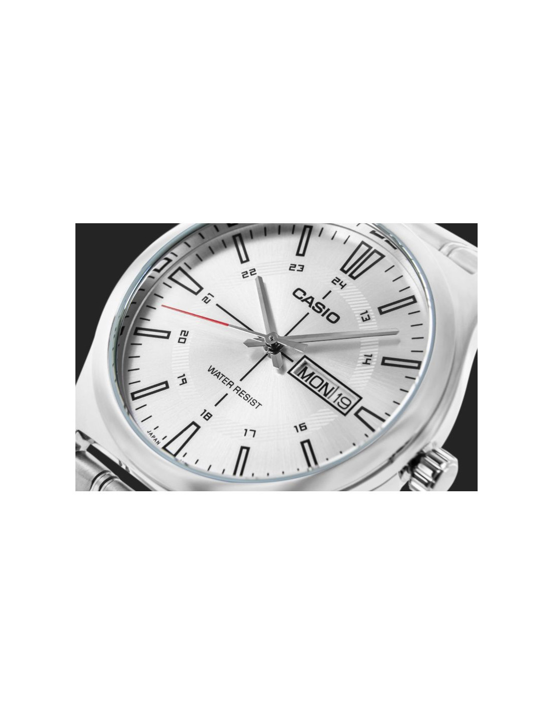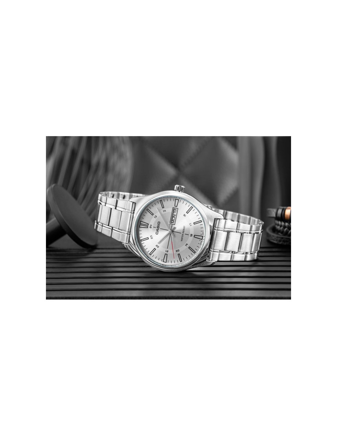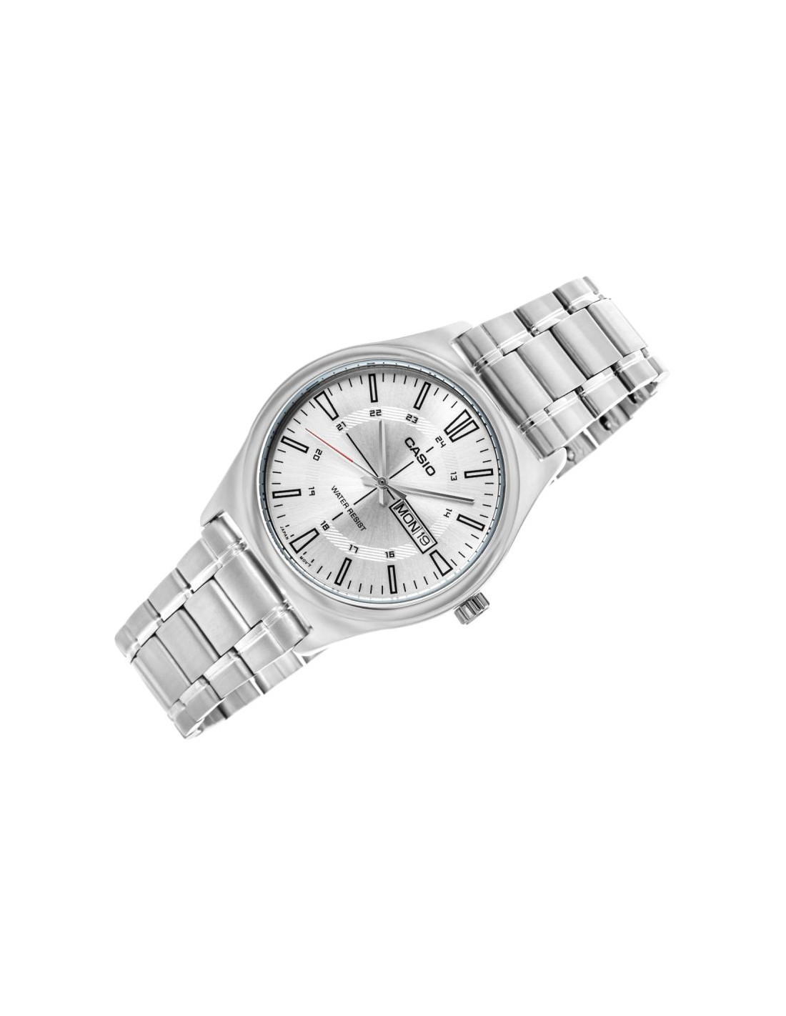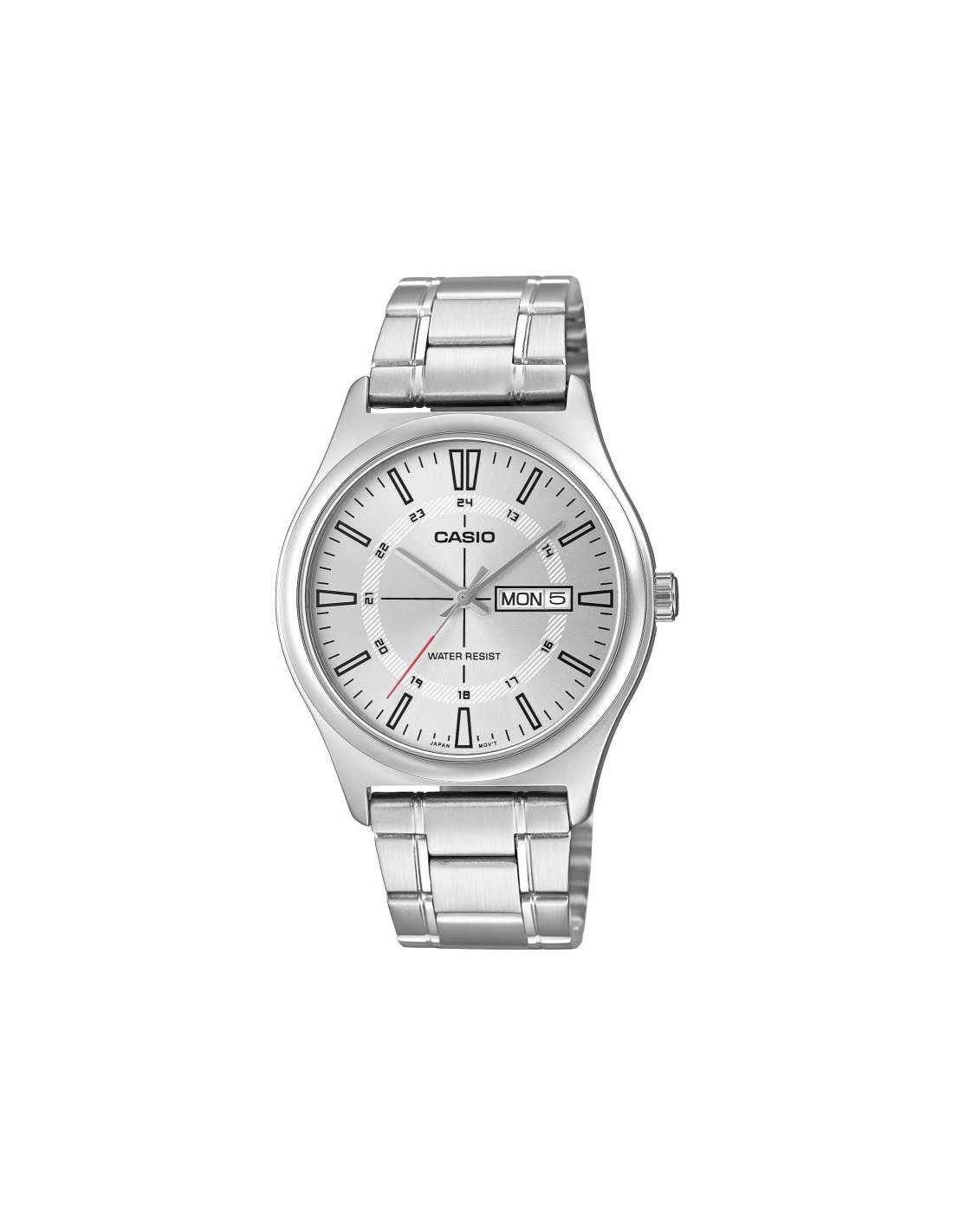 Męski model z kolekcji CASIO wyposażony w klasyczną 38-milimetrową kopertę ze stali nierdzewnej, czytelną tarczę z wyrazistymi indeksami godzinowymi oraz dodatkową skalą 24-godzinną, która ułatwia orientację w czasie. Funkcjonalny datownik umieszczony przy godzinie trzeciej umożliwia szybki podgląd aktualnego dnia tygodnia i dnia miesiąca, awodoodporność na poziomie WR gwarantuje bezpieczeństwo użytkowania w codziennych sytuacjach. Dziękibransolecie ze stali szlachetnej o matowym wykończeniu zegarek zyskuje elegancki charakter, który pasuje zarówno do garnituru, jak i do luźniejszego, miejskiego stylu. Mechanizm kwarcowy zapewnia precyzję i niezawodność, z której słynie marka Casio.