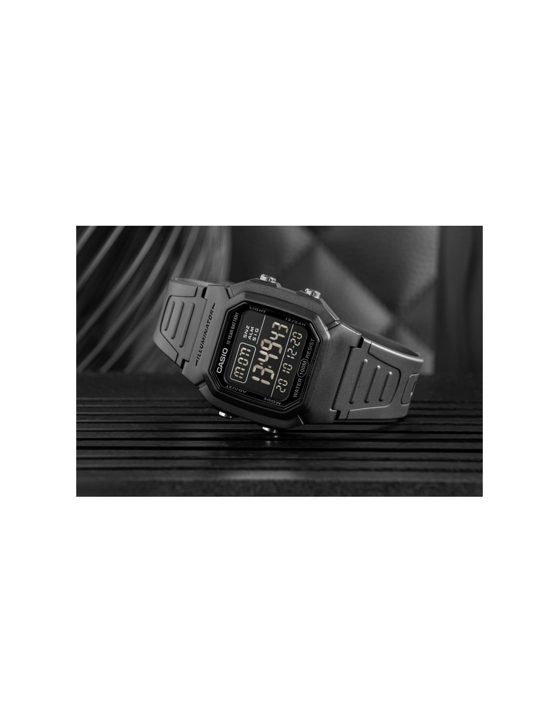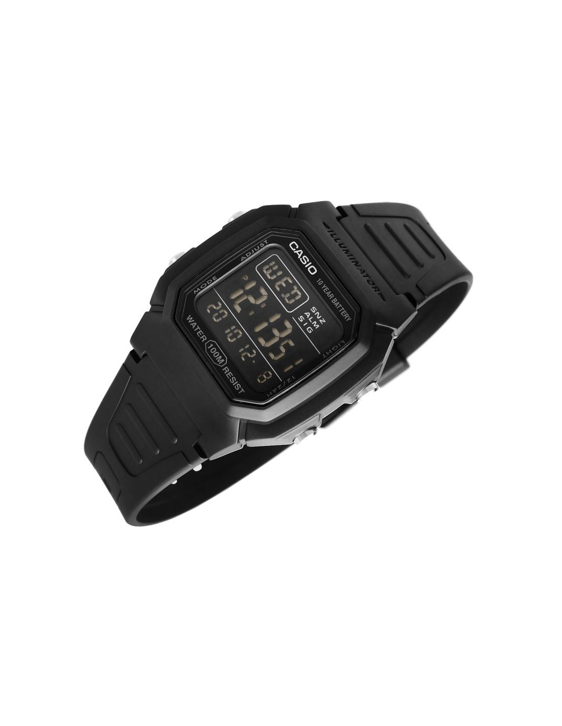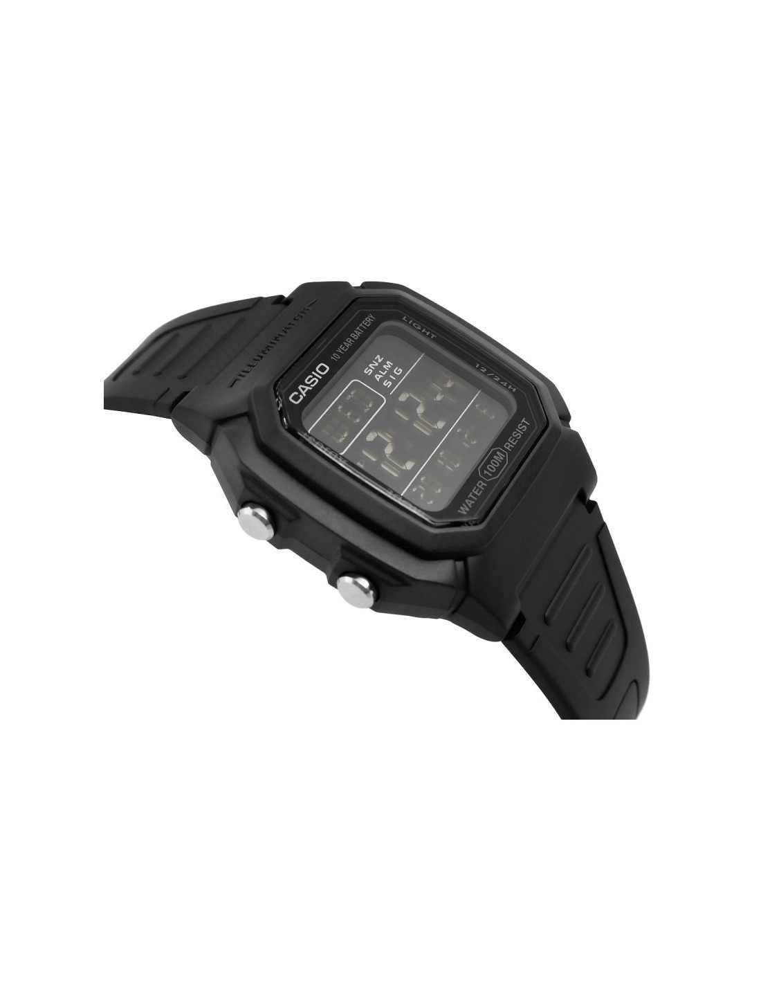 Zegarek Męski Casio W-800H to niezawodność w czytelniej formie - nowoczesny zegarek cyfrowy z dużym wyświetlaczem, który umożliwia szybki i łatwy odczyt godziny. Wyposażony w wodoszczelność do 100 metrów, baterię o żywotności 10 lat, podświetlenie LED oraz inne funkcje. Zegarek oferuje wszystkie najważniejsze informacje - godzina, data i dzień tygodnia - w dużej czytelnej formie. Dzięki funkcjom takim jak stoper 1/100 sekundy, podwójny czas i alarm z drzemką, świetnie sprawdza się zarówno podczas treningów, jak i w podróży. Wytrzymałe podświetlenie LED z efektem poświaty zapewnia dobrą widoczność nawet po zmroku. Solidna konstrukcja zapewnia trwałość w miejskiej dżungli i podczas outdoorowych przygód.