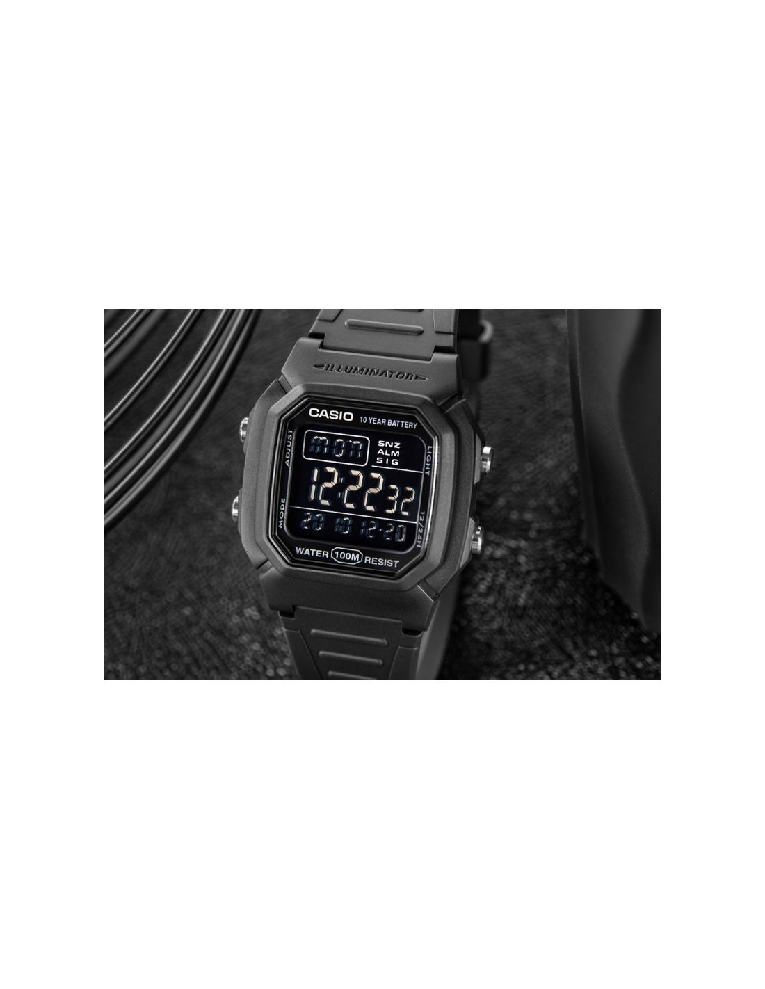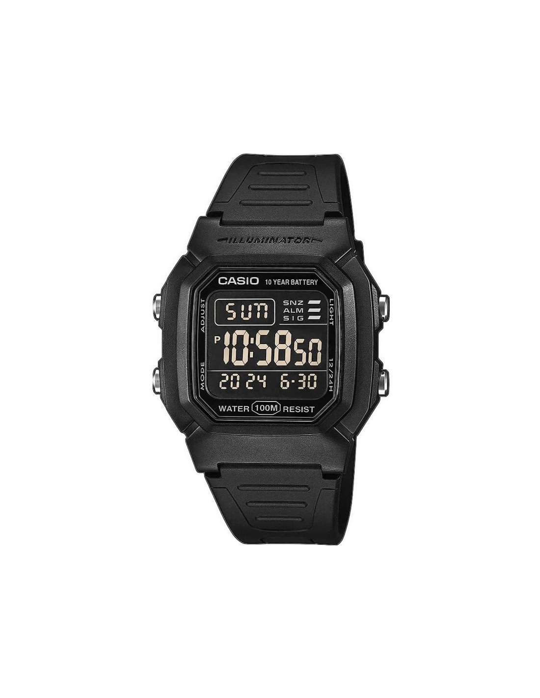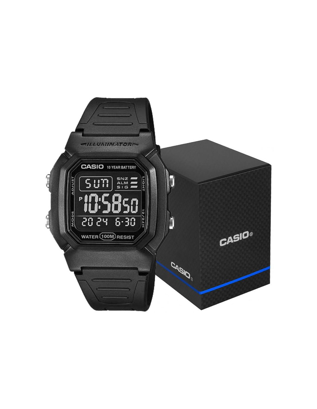 Zegarek Męski Casio W-800H to niezawodność w czytelniej formie - nowoczesny zegarek cyfrowy z dużym wyświetlaczem, który umożliwia szybki i łatwy odczyt godziny. Wyposażony w wodoszczelność do 100 metrów, baterię o żywotności 10 lat, podświetlenie LED oraz inne funkcje. Zegarek oferuje wszystkie najważniejsze informacje - godzina, data i dzień tygodnia - w dużej czytelnej formie. Dzięki funkcjom takim jak stoper 1/100 sekundy, podwójny czas i alarm z drzemką, świetnie sprawdza się zarówno podczas treningów, jak i w podróży. Wytrzymałe podświetlenie LED z efektem poświaty zapewnia dobrą widoczność nawet po zmroku. Solidna konstrukcja zapewnia trwałość w miejskiej dżungli i podczas outdoorowych przygód.