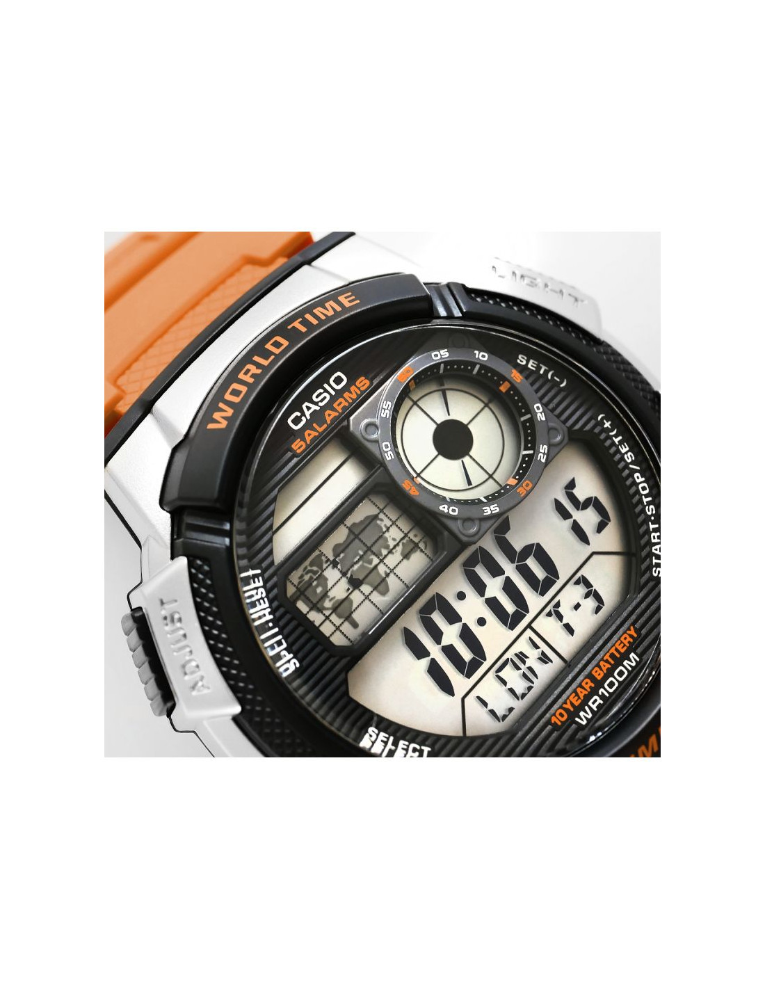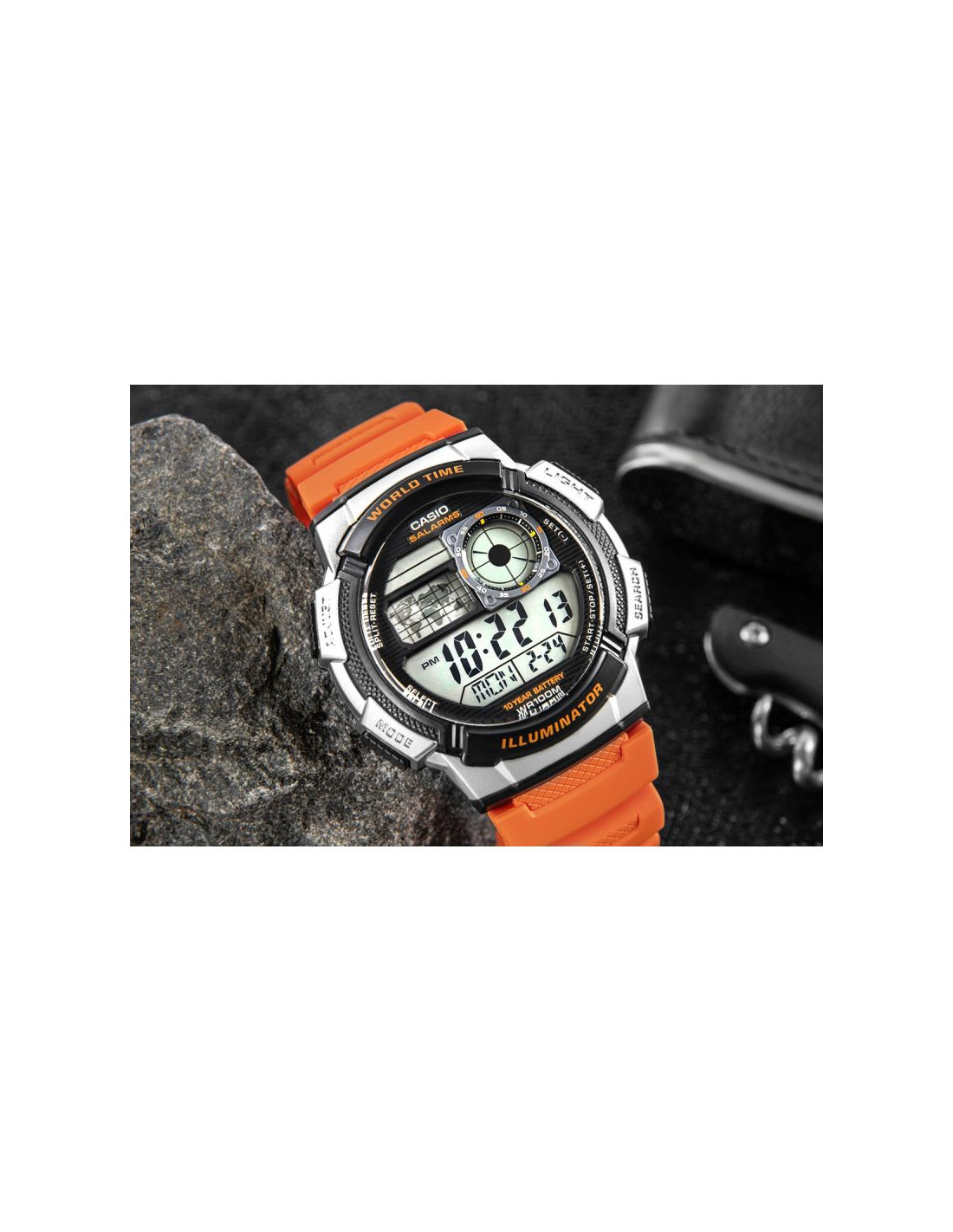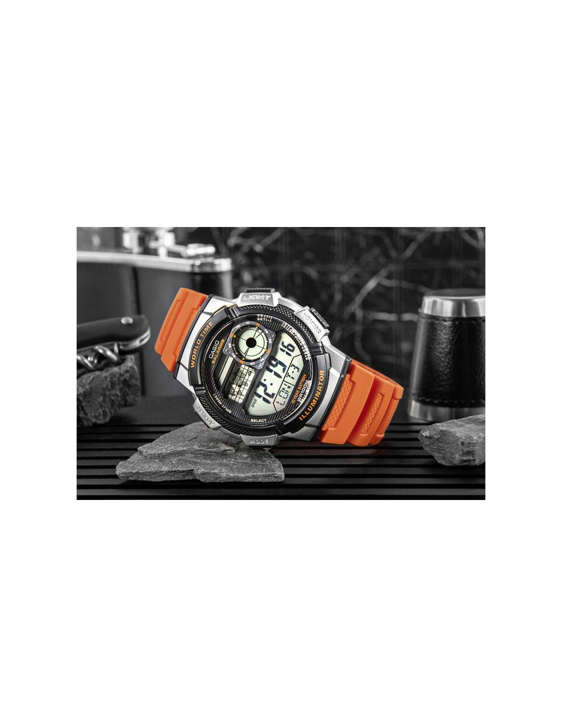 Model CASIO z Multi Time, światowym czasem, stoperem, alarmem x 5 i minutnikiem - a to wszystko 10 lat na jednej baterii. Casio AE-1000W to zegarek, który nadąża za Tobą - tarcza inspirowana kokpitem samolotu nadaje mu surowy, techniczny charakter, który podkreśla męski styl i dynamiczny tryb życia. Dzięki mapie świata i funkcji World Time możesz jednym rzutem oka sprawdzić czas w różnych strefach, co sprawia, że to idealny wybór dla podróżników i profesjonalistów pracujących na międzynarodową skalę. Wyświetlacz LC Analog sprawia, że zawsze masz pod ręką godzinę swojego miasta domowego, a wodoodporność do 100 metrów pozwala na swobodne użytkowanie zegarka w trudniejszych warunkach. To zegarek dla mężczyzn, którzy oczekują więcej – precyzji, trwałości i stylu.