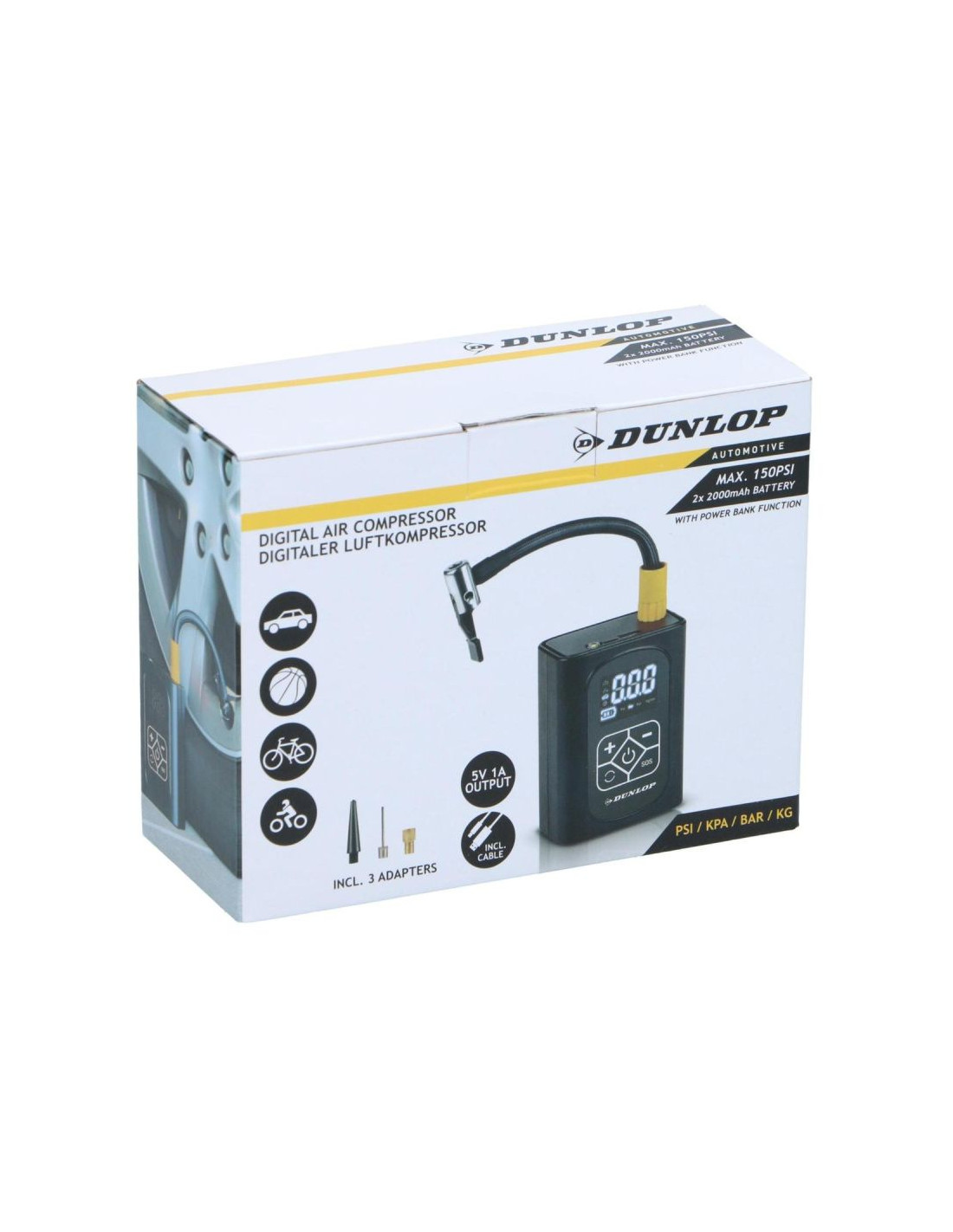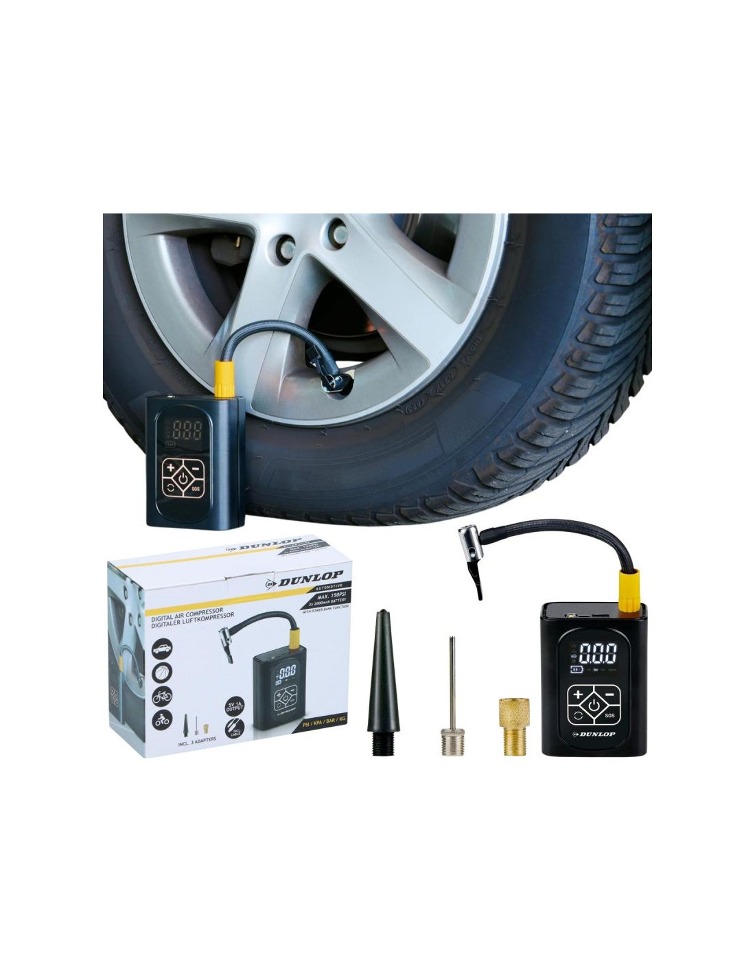 KOMPRESOR SAMOCHODOWY DUNLOP 150 PSI CYFROWA SPRĘŻARKA Z FUNKCJĄ POWERBANK to połączenie siły, precyzji i mobilności. Dzięki cyfrowemu sterowaniu, solidnej baterii i funkcji powerbanku zapewnia niezależność i bezpieczeństwo w każdej podróży. Wystarczy jedno urządzenie, by mieć zawsze pełne powietrze i energię pod ręką.