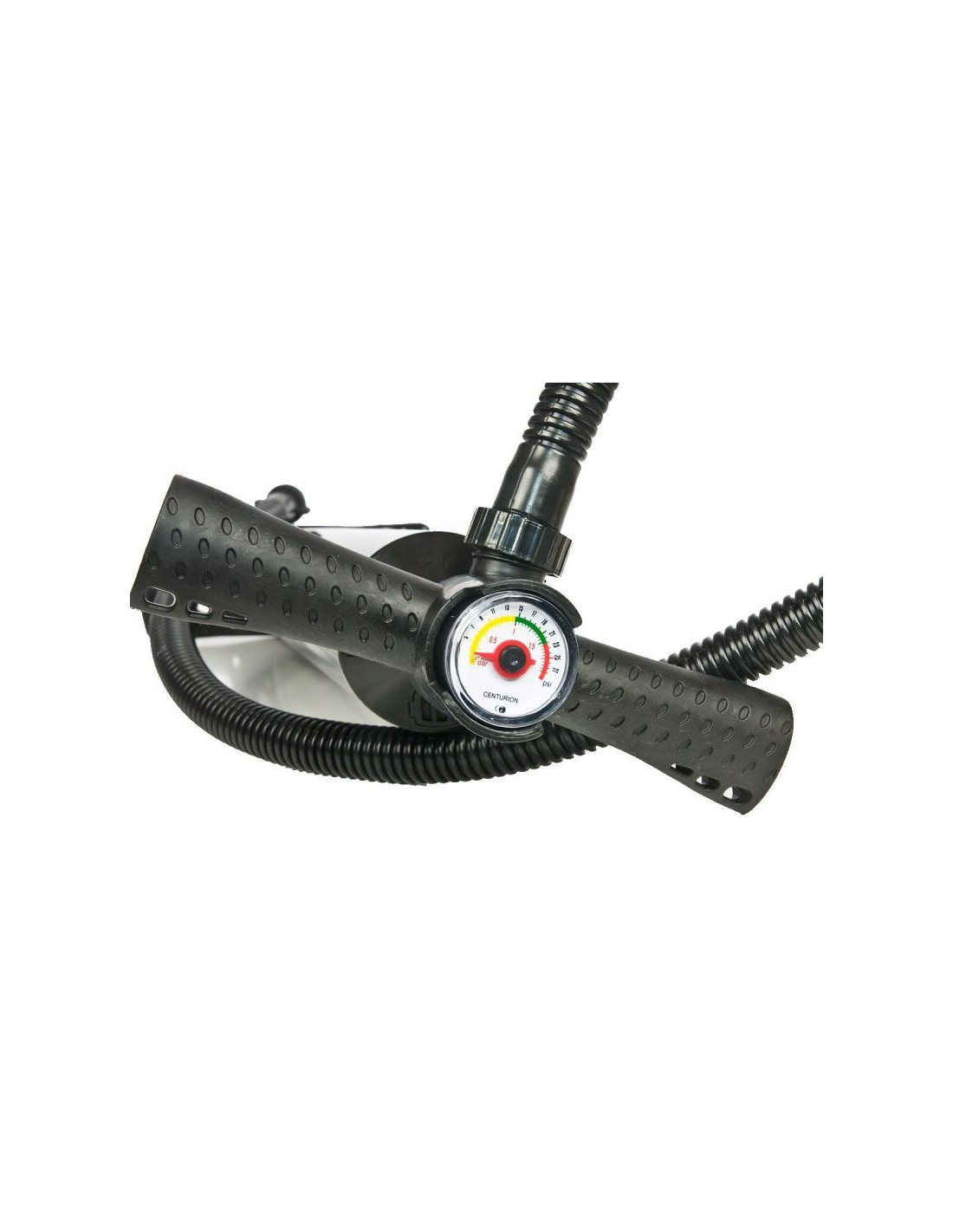 Wbudowany manometr służący do pomiaru parametrów podczas pompowania pokazuje ciśnienie w zakresie do 27 PSI, należy pamiętać, że uruchamia się po wstępnym napełnieniu deski.