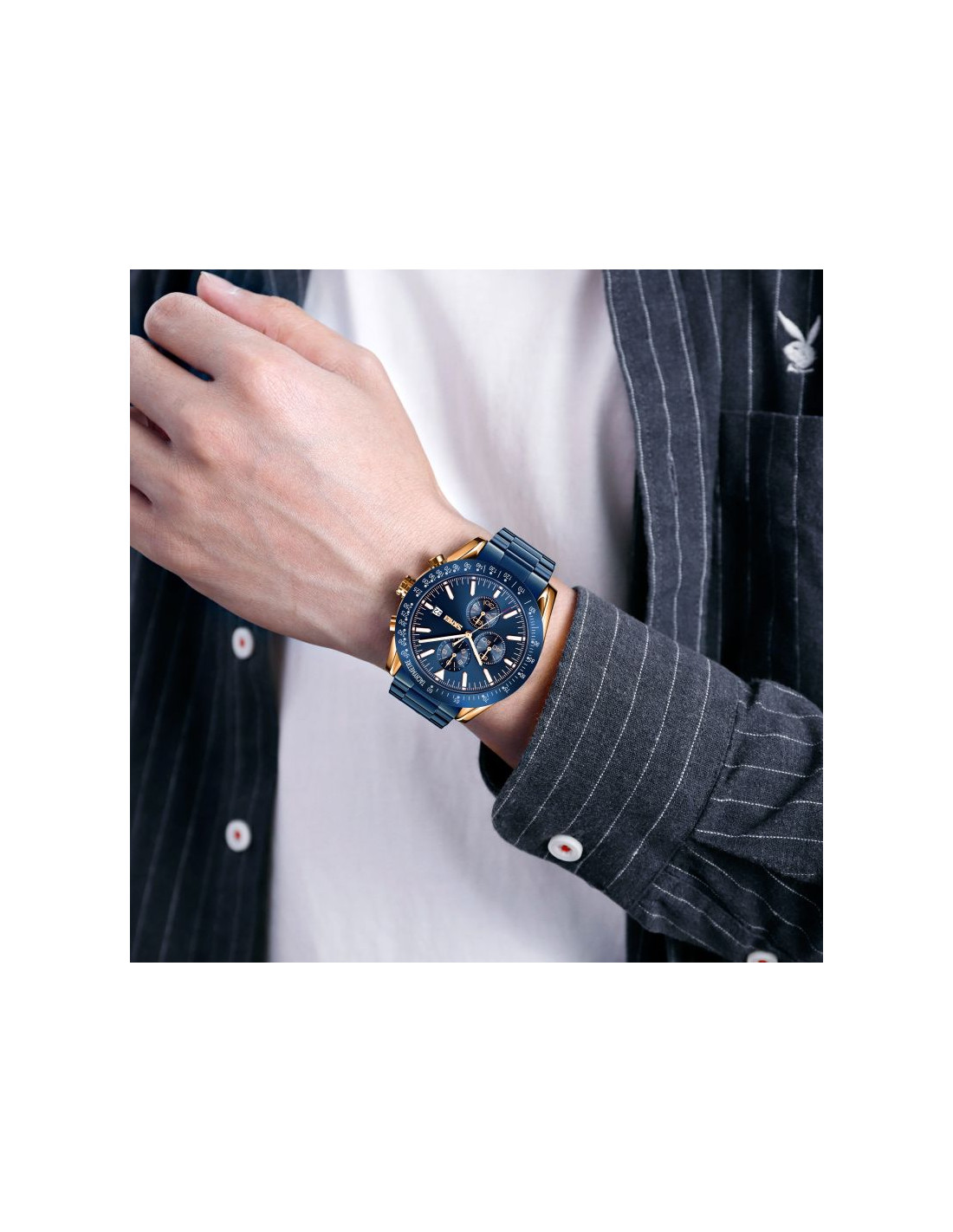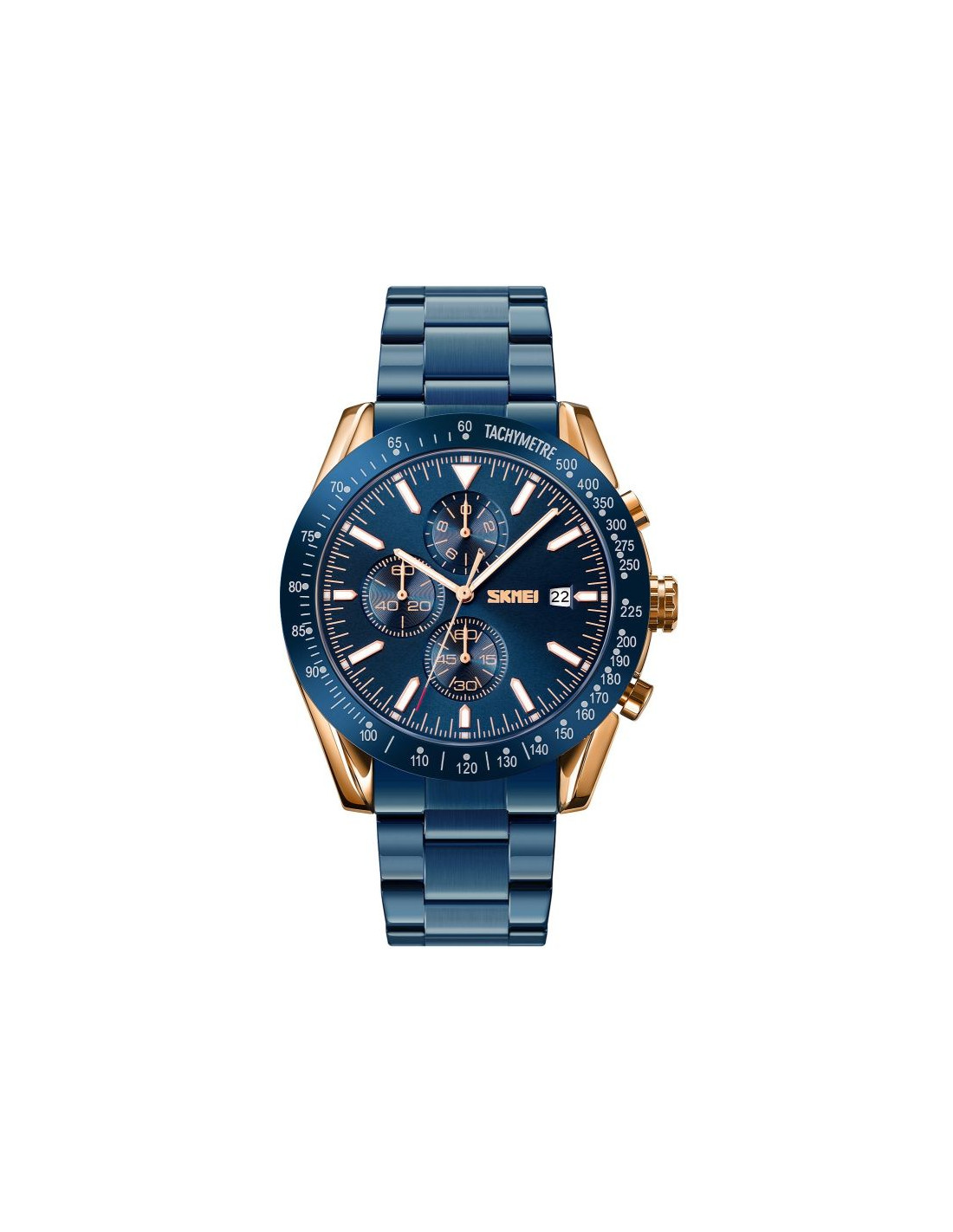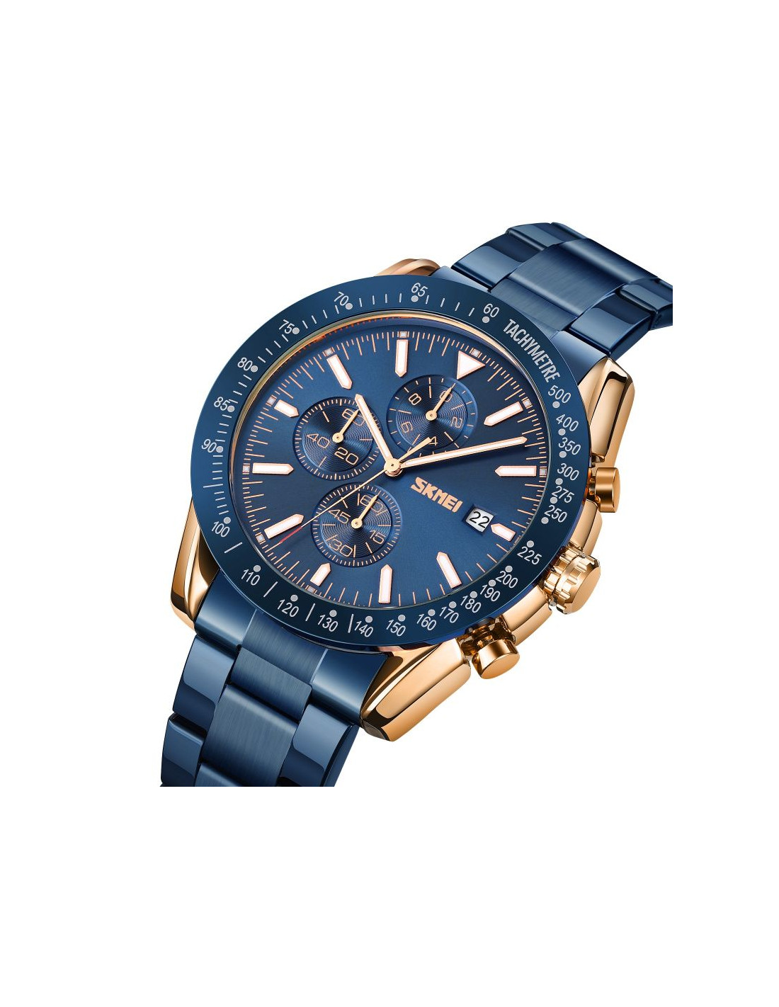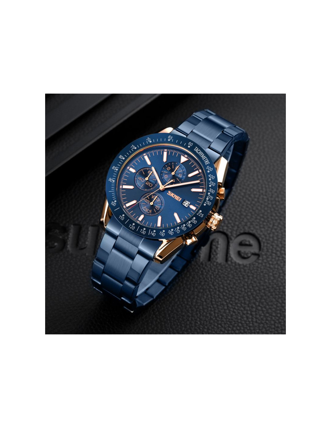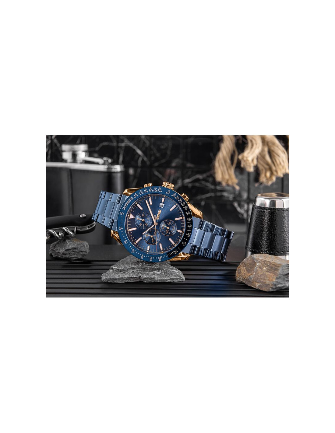 Zegarek Skmei 9253 prezentuje kolorystykę inspirowaną ekskluzywnymi zegarkami klasy premium, co nadaje mu wyjątkowego charakteru. Miedziana koperta i metaliczna granatowa bransoleta przywodzą na myśl luksus i elegancję, idealnie dopełniając granatowy kolor bezla i tarczy, co jest charakterystyczne dla najlepszych projektów światowych marek. Indeksy i wskazówki, wypełnione fluorescencyjną powłoką, nie tylko podkreślają luksusowy styl zegarka, ale również zapewniają doskonałą widoczność w każdym oświetleniu. Czerwony akcent na sekundniku dodaje mu sportowego charakteru, łącząc elegancję z dynamiką.