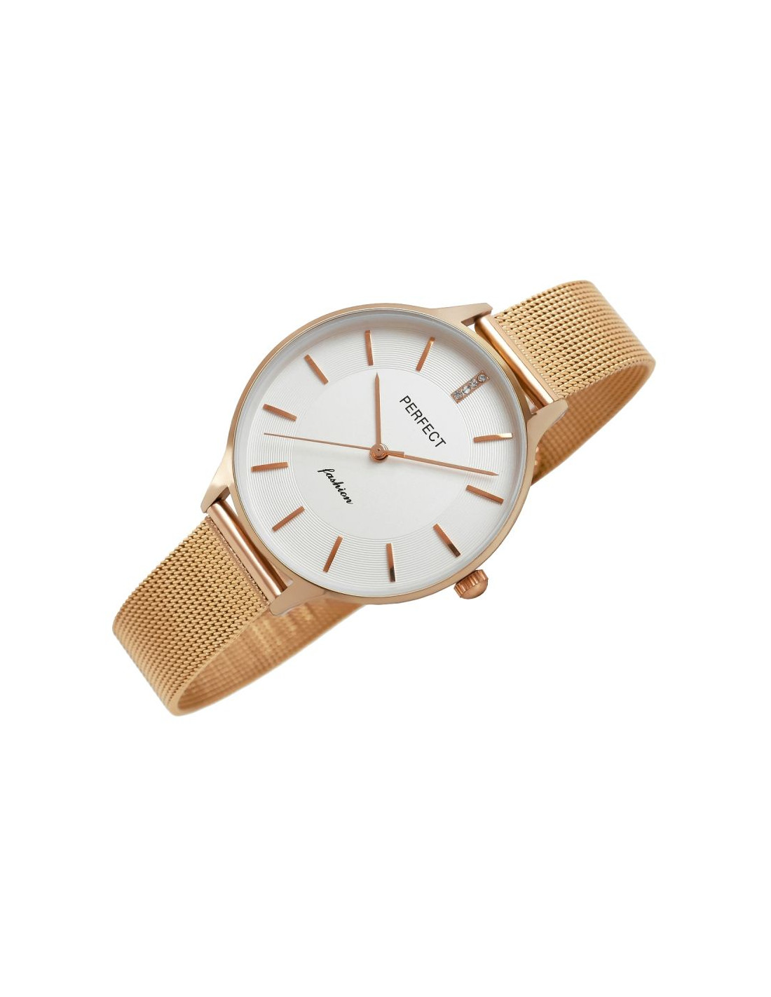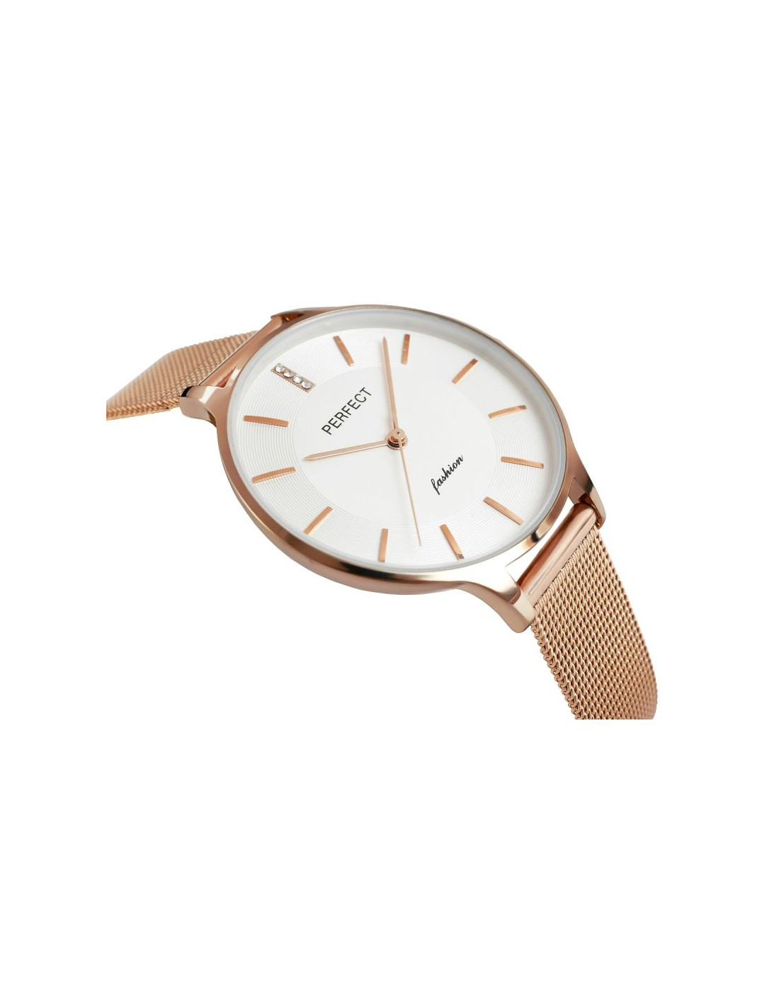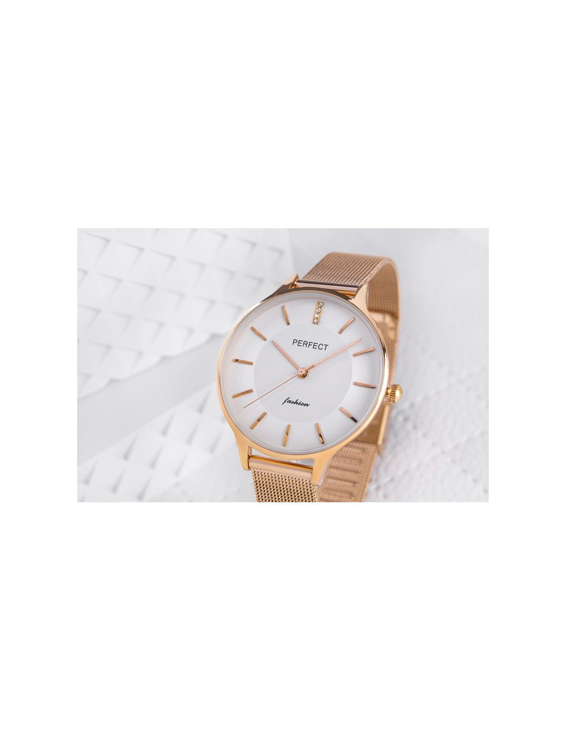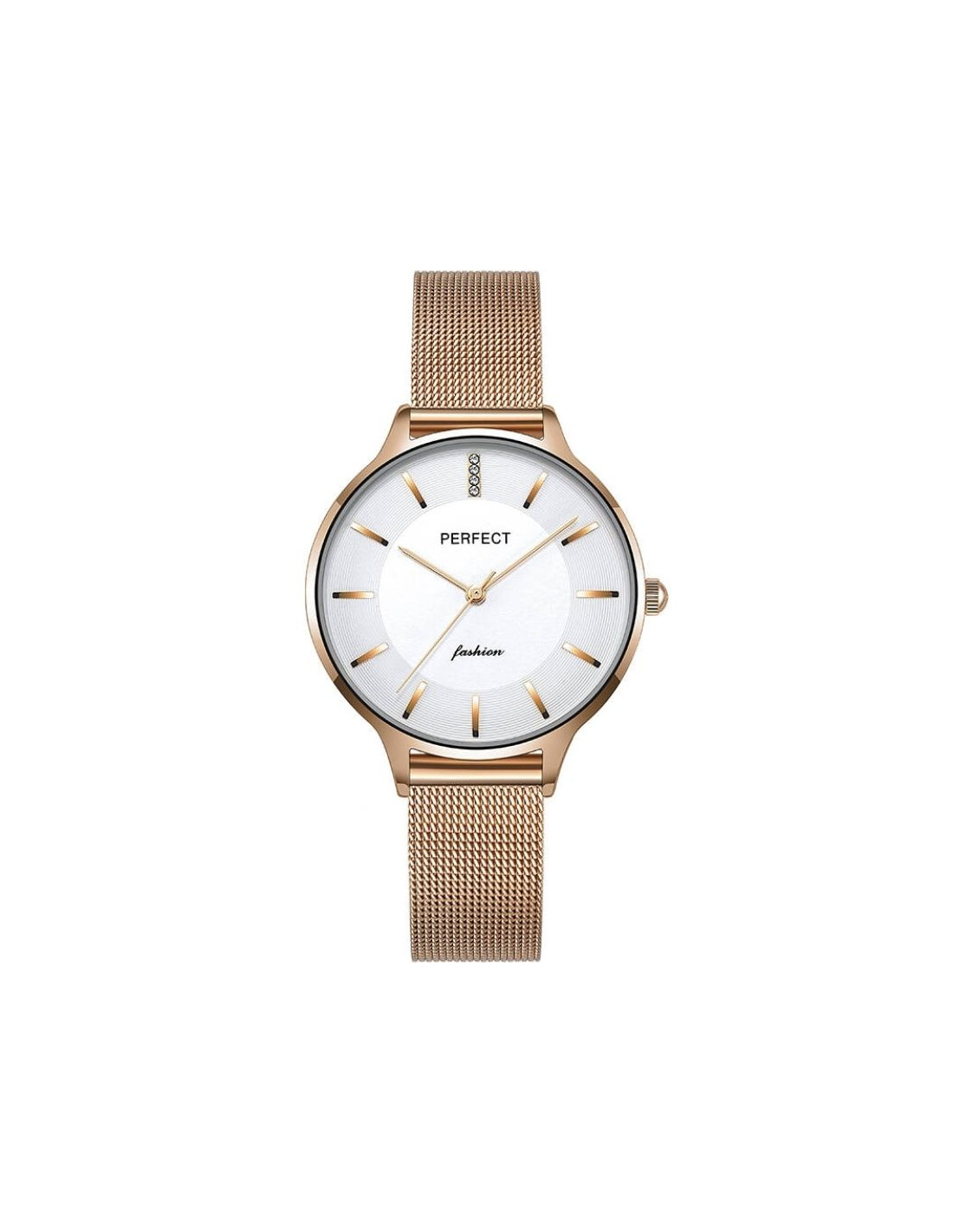 Wykonana z wysokiej jakości stali, idealnie dopasowuje się do damskiego nadgarstka, zapewniając wygodę noszenia przez cały dzień. Jej elegancka struktura i zapięcie ozdobione logiem marki Perfect dodają zegarkowi wyjątkowego stylu i wyróżniają go na tle innych.