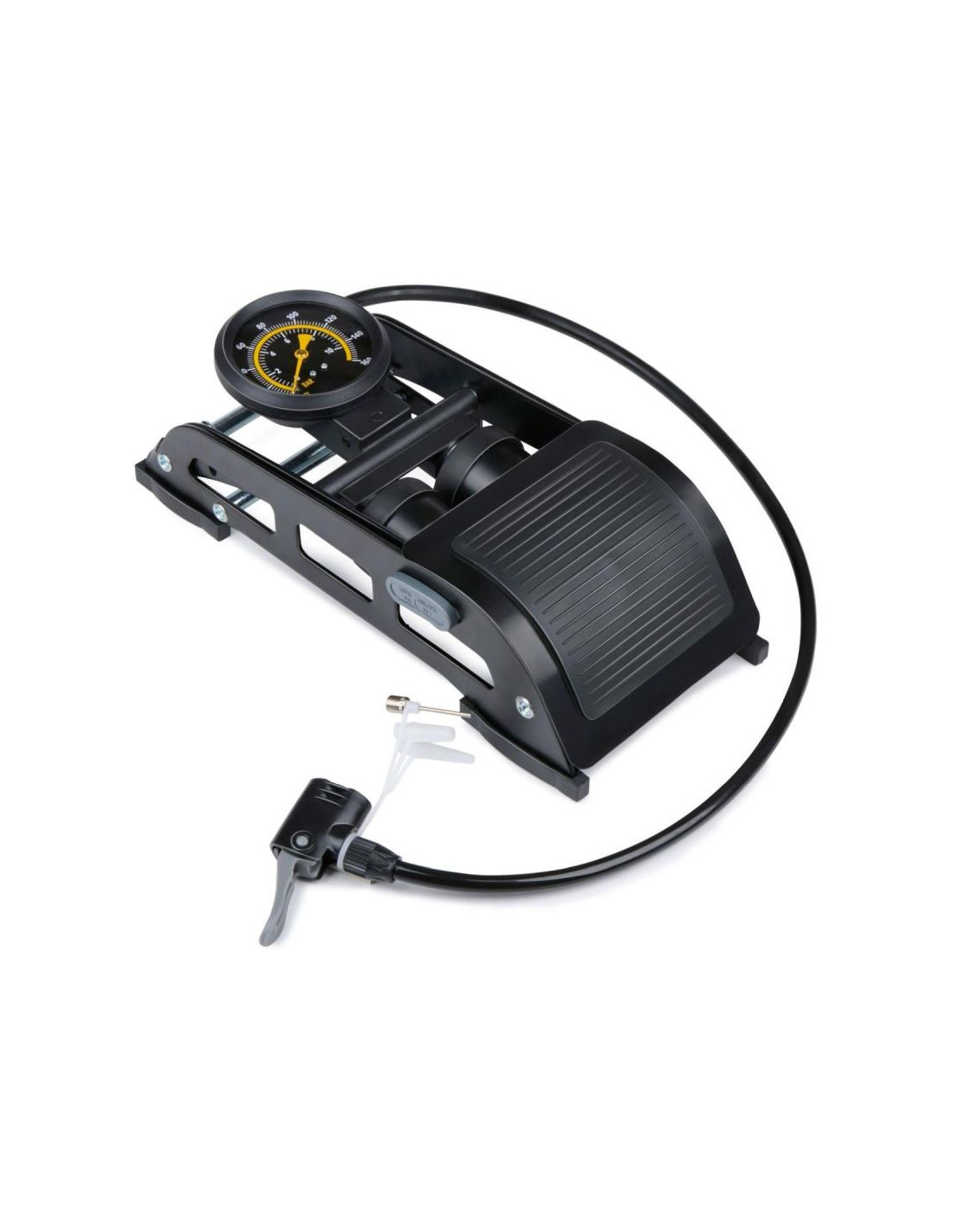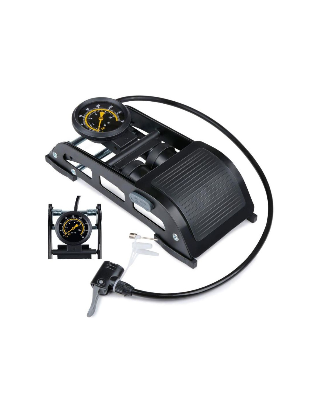 Wbudowany manometr pozwala na dokładne monitorowanie ciśnienia powietrza w pompowanym obiekcie w zakresie do 160 PSI (10 BAR). Dzięki temu możesz precyzyjnie dostosować ciśnienie do wymagań opony rowerowej, samochodowej czy piłki sportowej, co przekłada się na lepszą wydajność i bezpieczeństwo użytkowania.