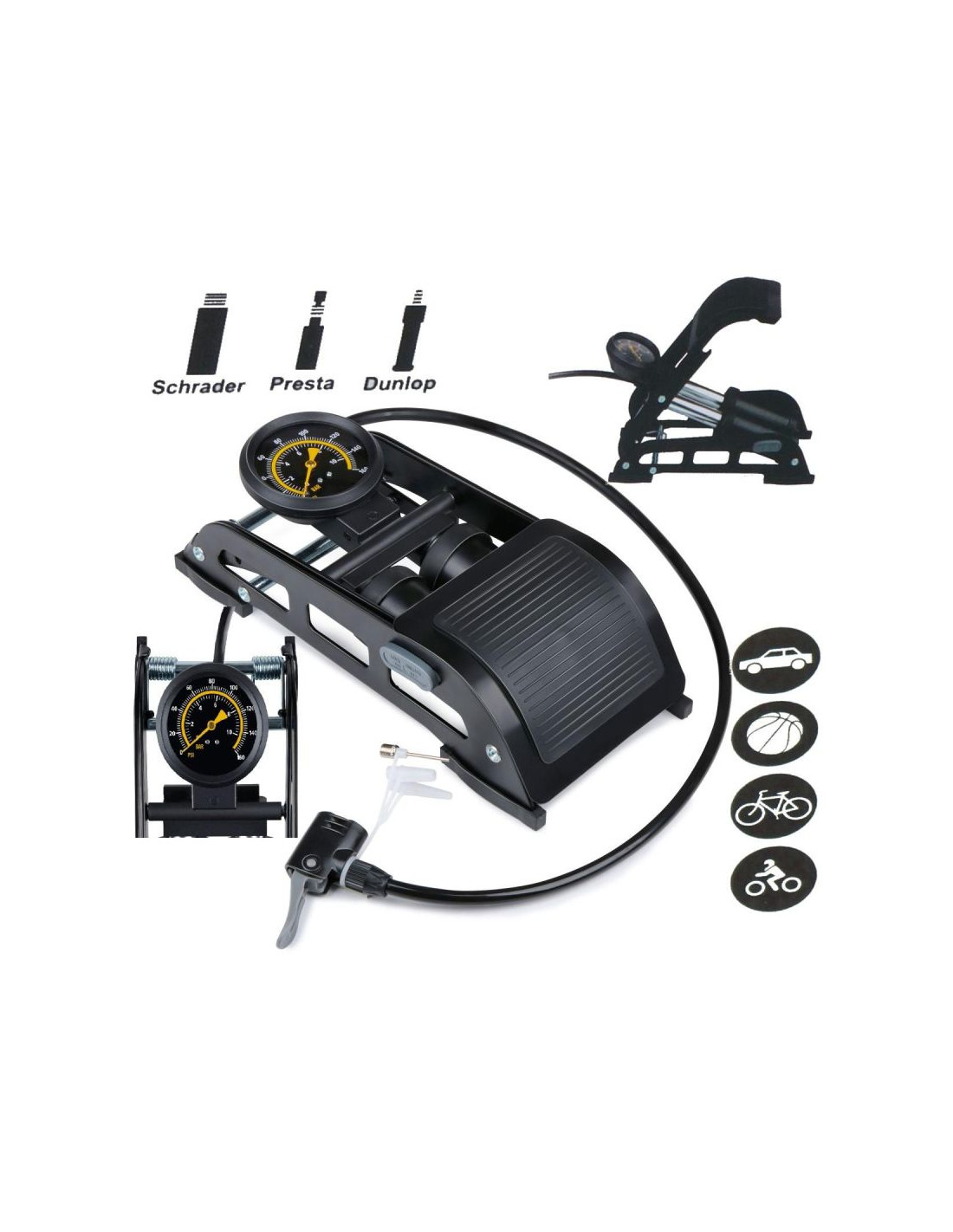 Dwutłokowa pompka z końcówkami Schrader, Presta, Dunlop jest niezwykle wszechstronna. Może być używana do pompowania opon rowerowych, co jest nieocenione podczas długich tras czy intensywnych treningów, ułatwia utrzymanie odpowiedniego ciśnienia w oponach samochodowych, co wpływa na bezpieczeństwo i ekonomikę jazdy. Będzie też idealna do pompowania piłek do siatkówki, piłek nożnych, koszykowych i innych, zapewniając ich odpowiednią twardość i gotowość do gry.