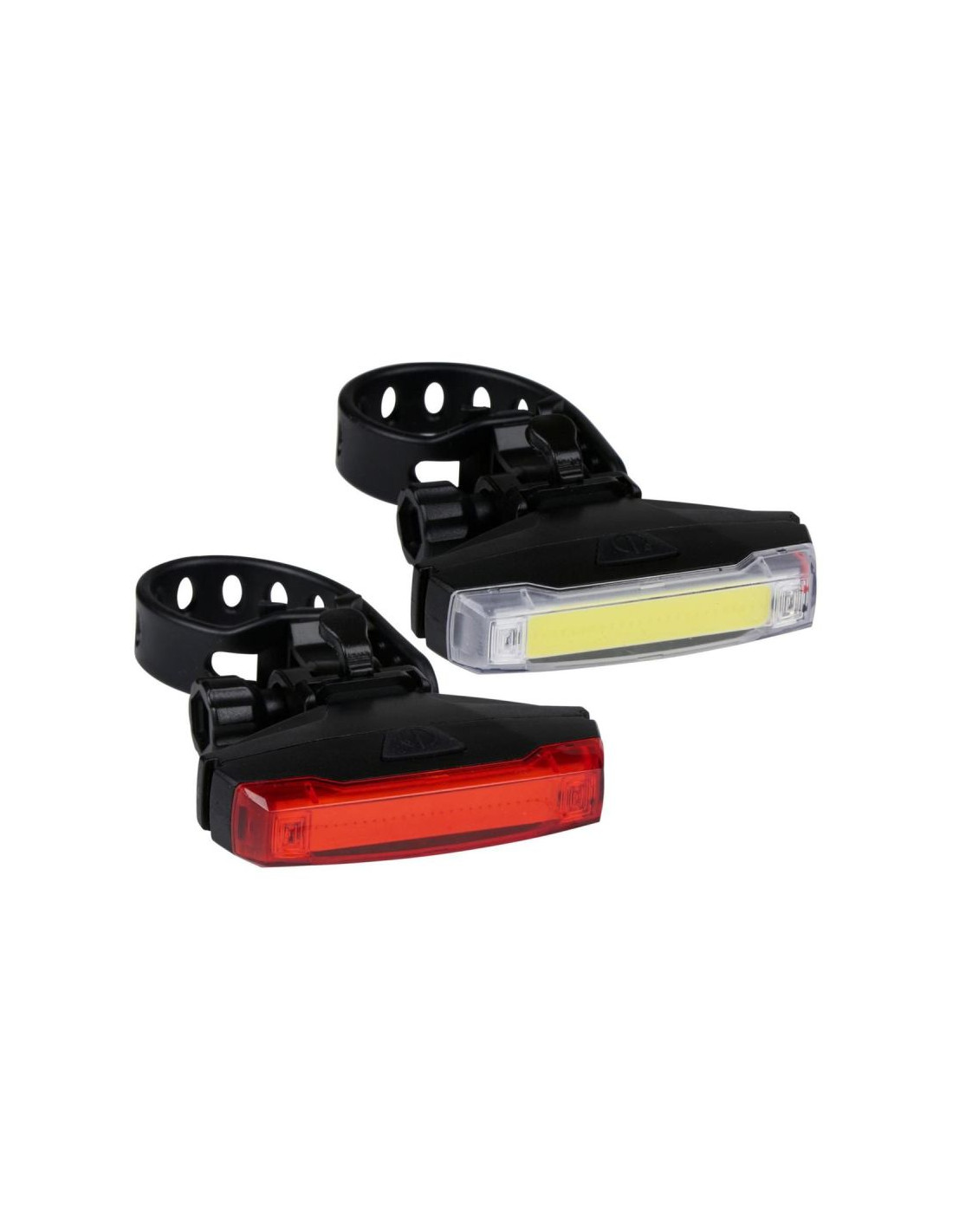 Komplet dwóch lamp LED – przednia biała rozświetla drogę, a tylna czerwona zapewnia, że jesteś widoczny z tyłu. To pełne oświetlenie spełniające podstawowe wymogi bezpieczeństwa na drodze.