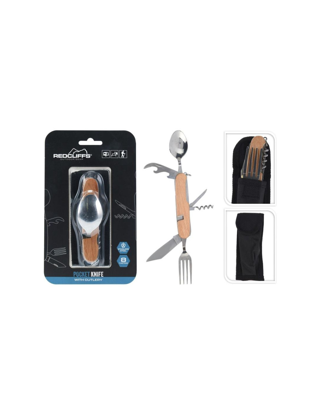 6 narzędzi przyda Ci się w wielu sytuacjach np.: nóż do cięcia i oskrobania złowionej ryby, nacinania, przecinania wielu rzeczy oraz materiałów, nożyk z ostrym końcem do robienia np.: dziurek, korkociąg posłuży do otwierania butelki z korkiem lub do rozwiązywania supłów. Otwieracz pomoże Ci otworzyć butelkę, łyżka i widelec do zjedzenia posiłków.