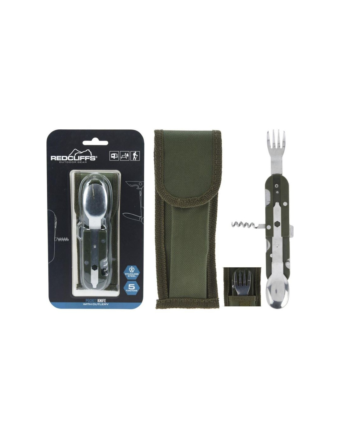 5 narzędzi przyda Ci się w wielu sytuacjach np.: nóż do cięcia i oskrobania złowionej ryby, nacinania, przecinania wielu rzeczy oraz materiałów, nożyk z ostrym końcem do robienia np.: dziurek, korkociąg posłuży do otwierania butelki z korkiem lub do rozwiązywania supłów. Otwieracz pomoże Ci otworzyć butelkę, łyżka i widelec do zjedzenia posiłków.