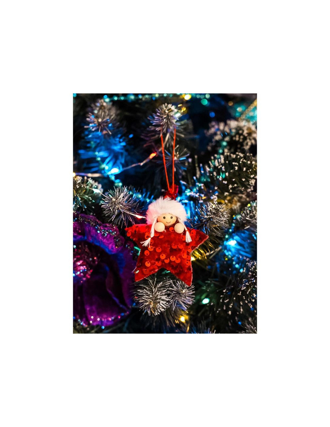 Nasze połyskujące w świetle zawieszki – gwiazdki z cekinami, możesz zawiesić na choince, na klamce od szuflady w biurku, na klamce w oknie albo wręczyć je jako dodatek do prezentu. Drewniane rączki, uśmiechnięta buźka i futrzana czapka dodają im uroku.
