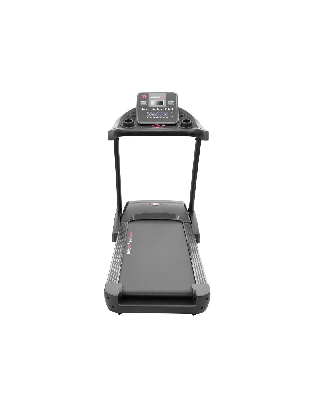 Panel sterujący pozwoli Ci na wybór programu, przyspieszyć lub zwolnić pracę taśmy, włączyć i wyłączyć urządzenie, zmienić kąt nachylenia taśmy, a 25 calowy ekran LCD z wielofunkcyjnym licznikiem, wskaże Ci m.in. puls, czas, prędkość, dystans i kalorie. Dodatkowo w rączkach umieszczono specjalne czujniki pulsu, które pozwolą kontrolować przez cały trening pracę Twojego serca oraz przyciski do zmiany kąta nachylenia lub zwiększania i zmniejszania prędkości.