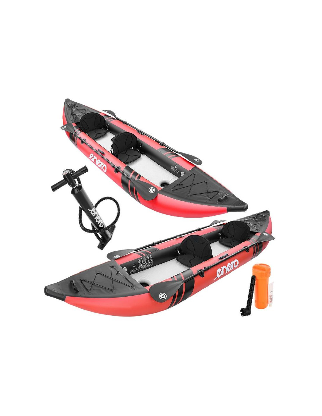 W zestawie: kajak, wiosło 2 szt., pompka, podnóżek x2, siedzenie 2 szt., zestaw naprawczy, torba transportowa.