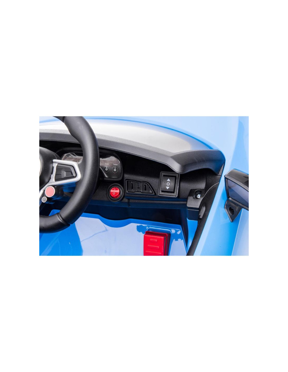 Specjalny czerwony przycisk aktywuję jazdę do przodu lub do tyłu, a ruchoma kierownica pozwala dziecku na wybór kierunku jazdy.