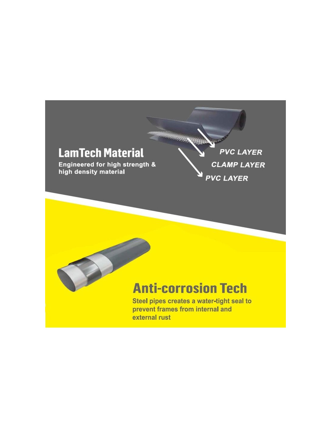 Basen wyposażony jest w wzmocniony stelaż z technologią ANTI-CORROSION, która zapewnia doskonałą ochronę przed rdzewieniem i uszkodzeniami spowodowanymi wilgocią. Dzięki temu basen zachowuje swoją wytrzymałość i estetyczny wygląd nawet po wielu sezonach użytkowania.