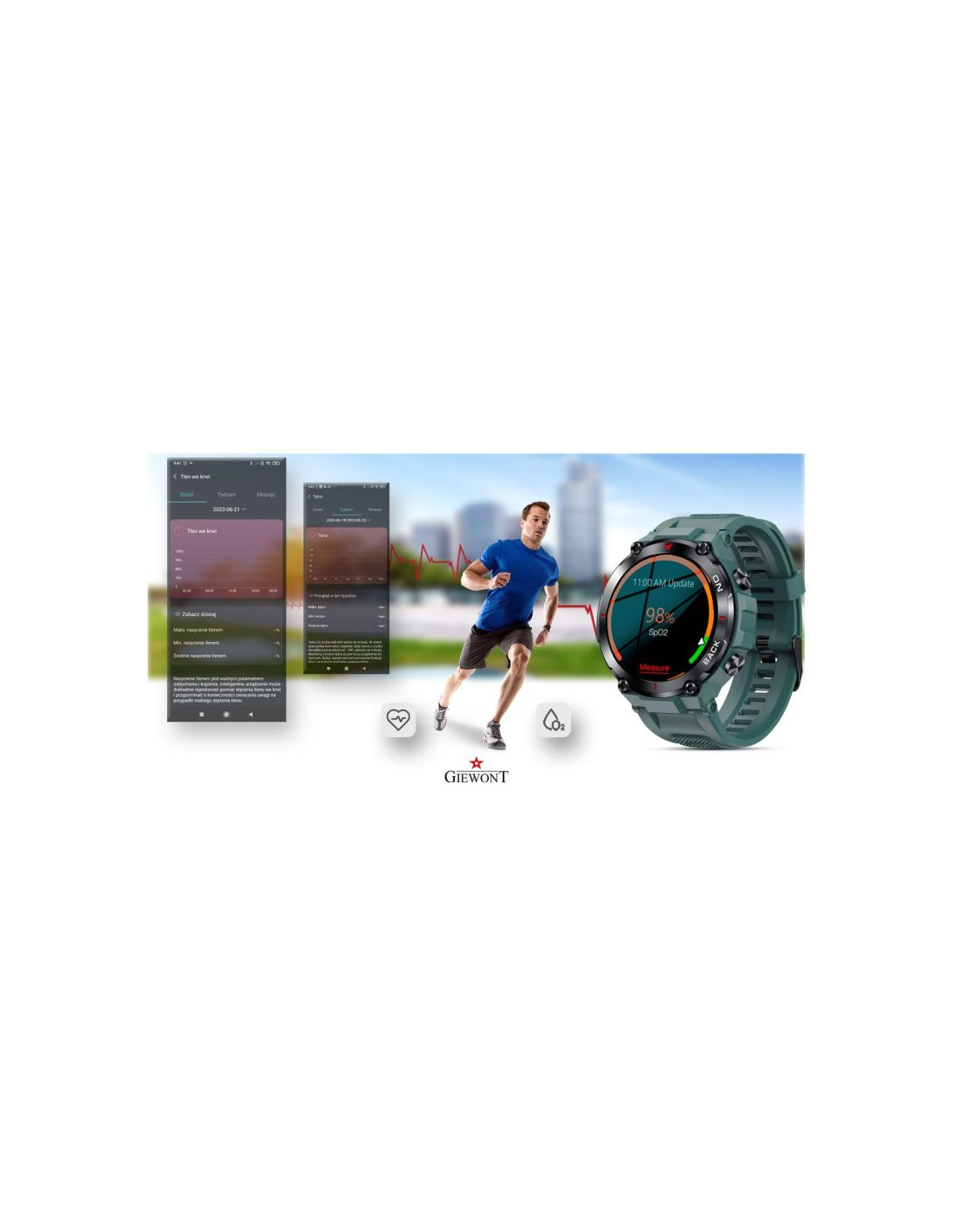 Dzięki sensorowi możesz w każdej chwili zmierzyć lub wykonać pomiar: tętno lub saturację - zawartość tlenu we krwi w swoim organizmie. Kontroluj wyniki podczas każdej aktywności fizycznej. Niezależnie czy jeździsz na rowerze, biegasz, czy też po prostu jesteś w pracy lub odpoczywasz. Twój smartwatch Giewont stanie się osobistym asystentem dbającym o twoje zdrowie każdego dnia.
