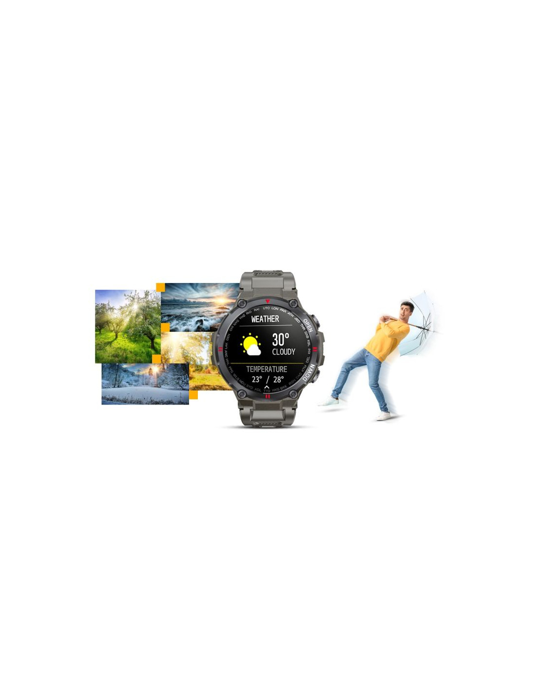 Smartwatch po podłączeniu z aplikacją wyświetla dane o pogodzie.Teraz wystarczy jedno spojrzenia na smartwatcha i już wiesz jaka pogoda będzie Ci towarzyszyć w najbliższym czasie.Dzięki pogodzie w smartwatchu możesz lepiej zaplanować swoją aktywność i ubrać się odpowiednio do otaczającej aury!