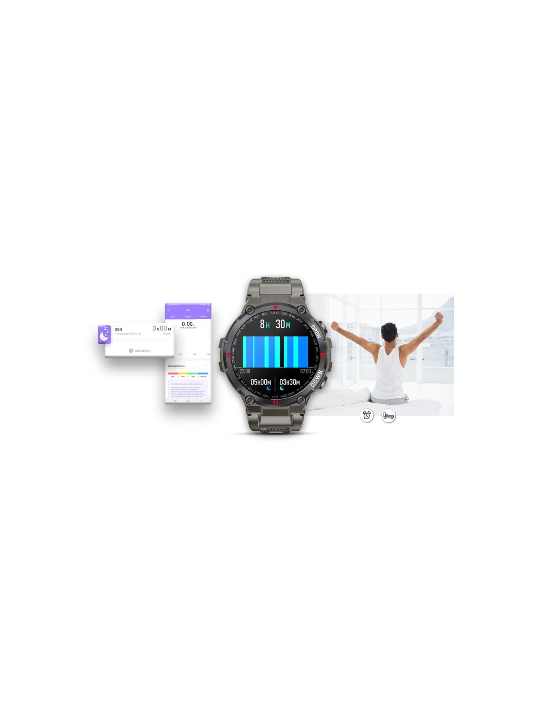 Funkcja tapozwala monitorować czas i jakoś snu każdej nocy. Po zsynchronizowaniu danych z aplikacją możesz sprawdzać i analizować jakość swojego snu. Historia pokaże jak śpisz i czy twój sen jest dobrej jakości. Po ciężkim dniu każdy musi się wyspać, żeby nabrać sił na kolejny dzień i w tym pomoże Ci ten smartwatch.