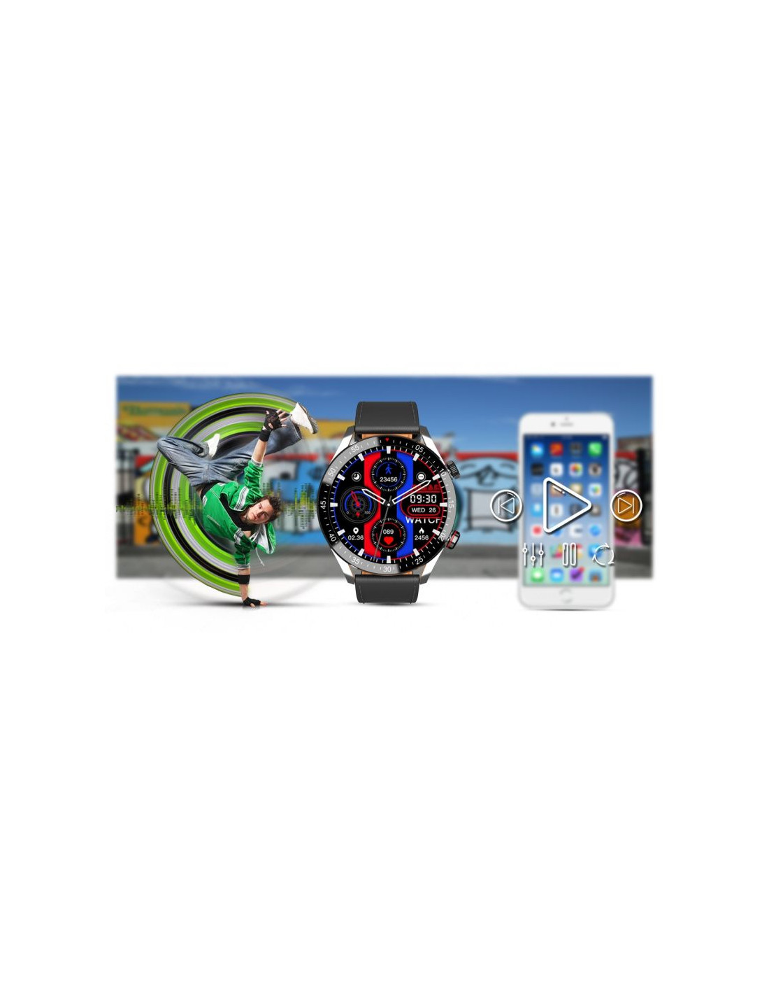 Każdy lubi słuchać swoją ulubioną muzykę. Dzięki bezprzewodowemu połączeniu poprzez bluetooth, od teraz możesz sterować odtwarzaczem muzycznym twojego telefonu komórkowego z poziomu smartwatcha. W ten sposób możesz uprawiać sport w rytm ulubionej muzyki lub relaksować się bez konieczności wyciągania smartfona.