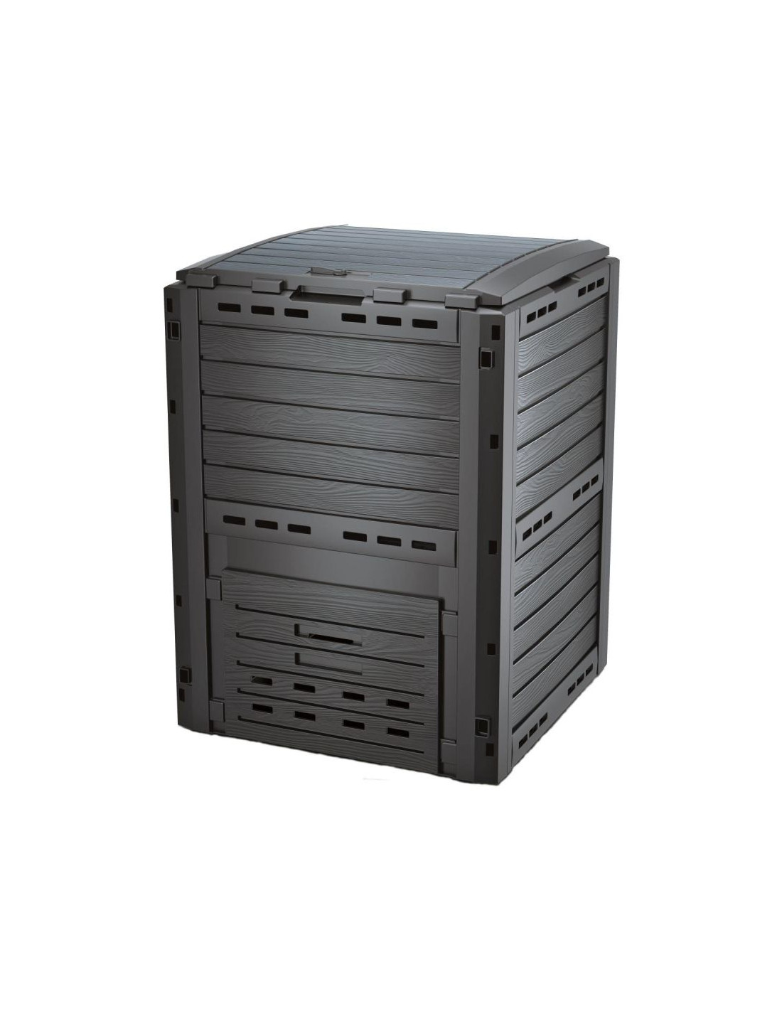 Zamknięta forma i zabezpieczenie w formie przykrywek ograniczy dostęp wszelkich zwierząt do zebranych odpadów, a otwory zapewnią dopływ niezbędnego powietrza. Dolna uchylana zasuwa, ułatwi dostęp do wyprodukowanego kompostu w każdym momencie, nawet gdy jest na dnie zbiornika, a specjalna rączka blokująca klapę, umożliwi wygodne wrzucenie odpadów do środka! Jest lekki i wytrzymały na zmienne warunki atmosferyczne, będzie Ci służył przez wiele lat.