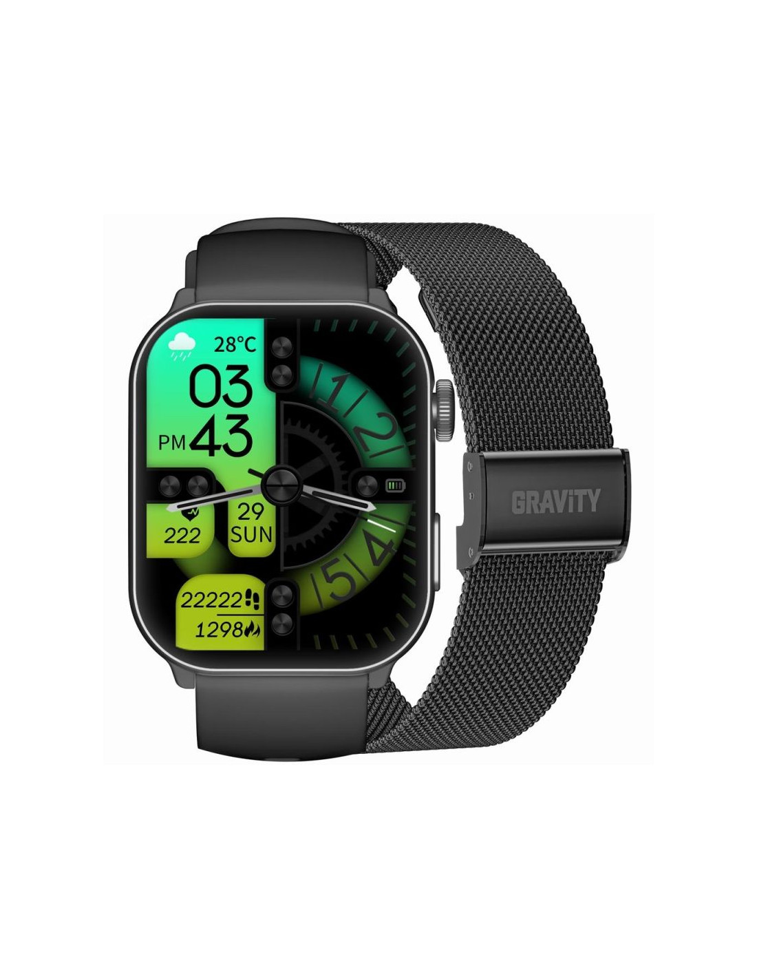 Smartwatch GRAVITY GT28 to elegancki zegarek z zaawansowanymi funkcjami, który świetnie sprawdzi się zarówno w codziennym użytkowaniu, jak i podczas aktywności sportowych. Wyposażony w prostokątną kopertę ze stopu metali i wygodny pasek (silikonowy lub mesh), prezentuje się stylowo i komfortowo leży na nadgarstku.
