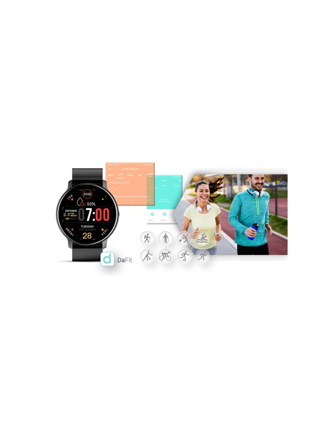 -Tryby Sportowe (bieganie, chodzenie, skakanie, badminton, koszykówka, piłka nożna, jazda na rowerze, pływanie)