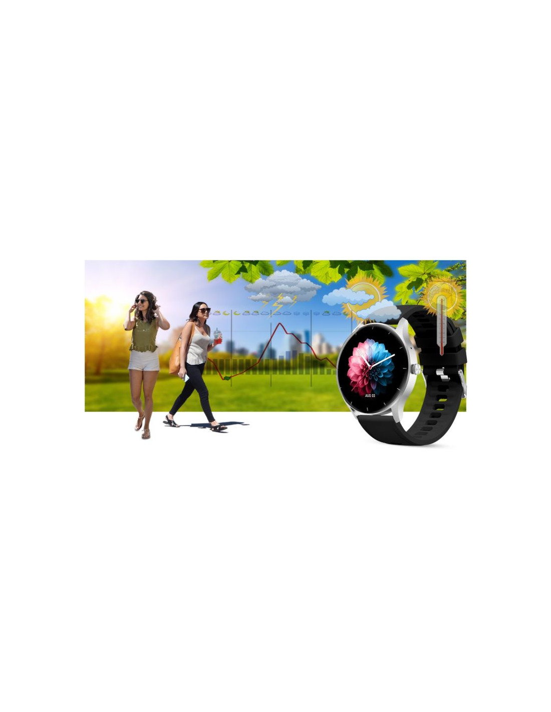 Smartwatch po podłączeniu z aplikacją wyświetla dane o pogodzie.Teraz wystarczy jedno spojrzenia na smartwatcha i już wiesz jaka pogoda będzie Ci towarzyszyć w najbliższym czasie.Dzięki pogodzie w smartwatchu możesz lepiej zaplanować swoją aktywność i ubrać się odpowiednio do otaczającej aury!