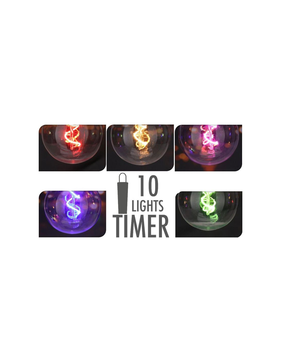 GIRLANDA OGRODOWA PARTY LIGHT 10 LED G80 MULTIKOLOR Z TIMEREM – 9,5 m to idealne rozwiązanie dla każdego, kto chce stworzyć wyjątkowy klimat na zewnątrz! Kolorowe żarówki G80 w połączeniu z funkcją timera zapewniają nie tylko efektowny wygląd, ale też wygodę użytkowania – bez potrzeby codziennego włączania i wyłączania.