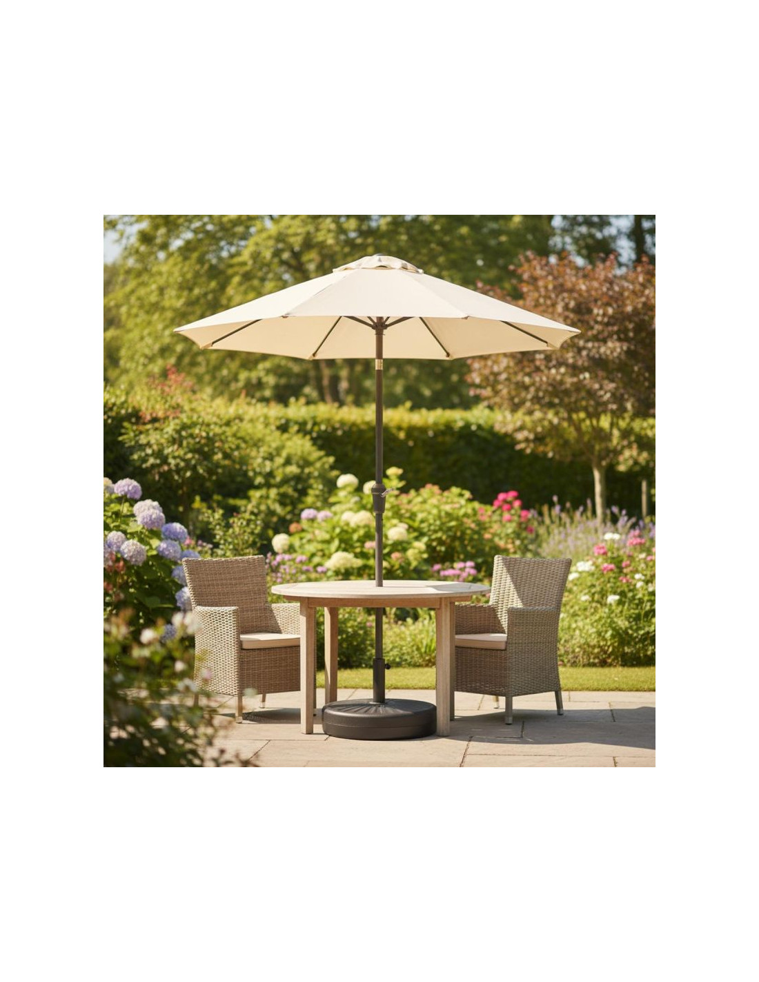 Okrągły kształt podstawy ma naturalną, harmonijną formę, która łatwo komponuje się z różnorodnymi stylami ogrodowymi – od nowoczesnych po klasyczne, rustykalne czy minimalistyczne. Dzięki temu możesz swobodnie dopasować parasol do istniejącej dekoracji bez obaw o konflikt stylów.