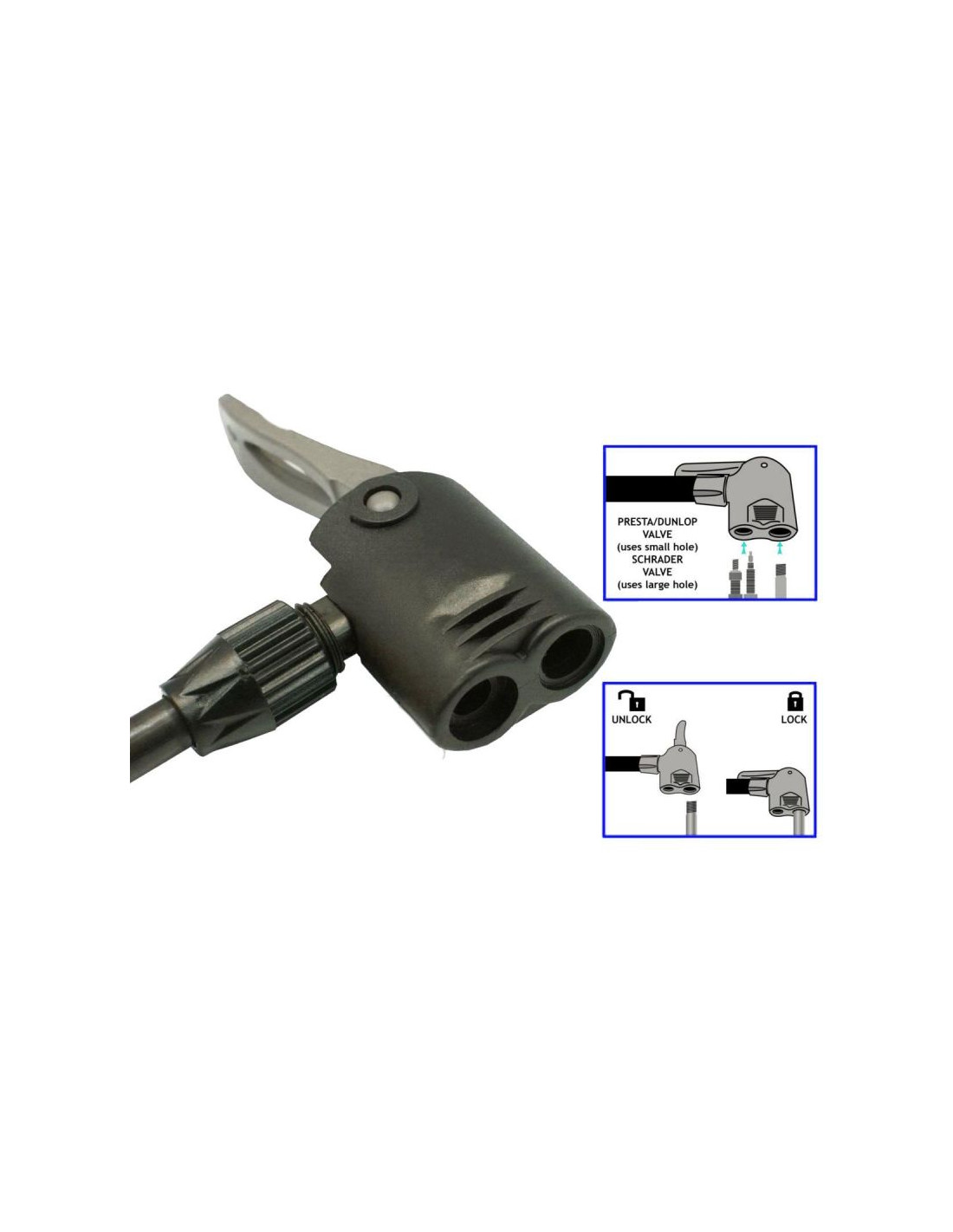 Wężyk posiada specjalny systemem blokowania, który bezpiecznie zamocuje go do zaworu, dzięki czemu powietrze nie ucieka podczas pompowania. Wytrzymały uchwyt i podnóżek sprawiają, że odciąganie jest wygodne nawet przy wysokim ciśnieniu.