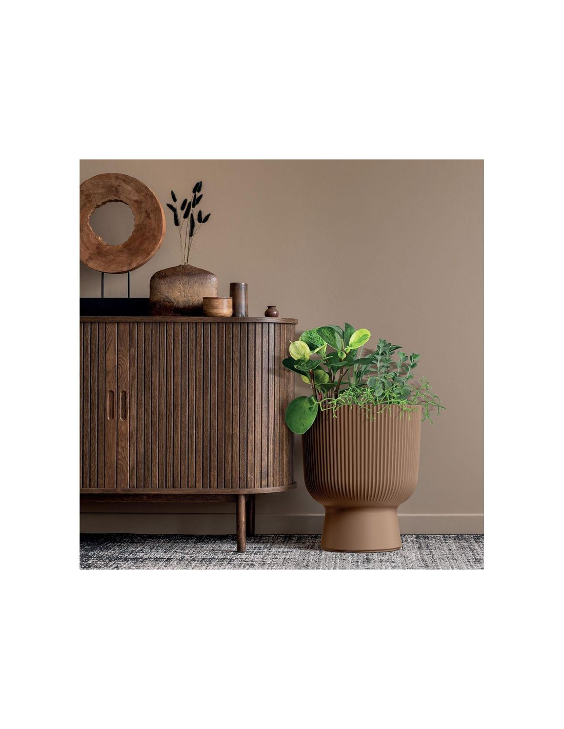 Doniczka z serii Milly z gustownym wzorem złożonym z pionowych pasów przyciąga uwagę i nadaje jej wyjątkowego charakteru. Jej klasyczna forma oraz stonowane kolory sprawiają, że idealnie wpasuje się w wiele współczesnych aranżacji, wprowadzając designerski akcent do wnętrz lub otwartych przestrzeni ogrodu lub tarasu.