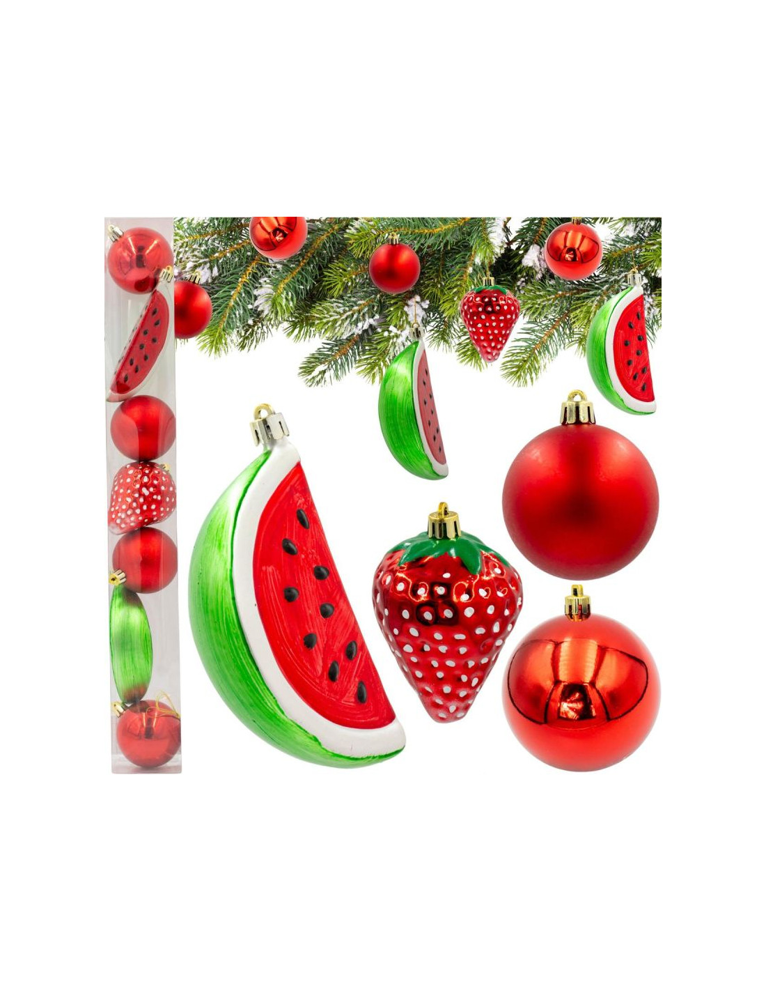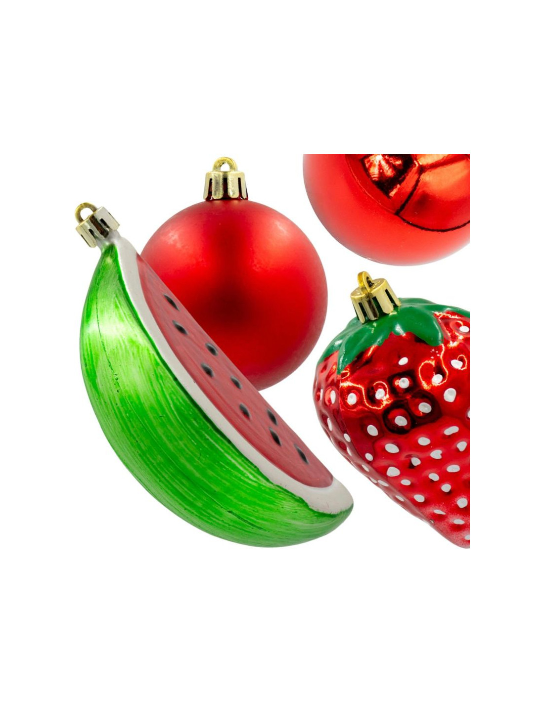 - mieszanka kulistych bombek z 2 w kształcie arbuza i 1 w kształcie truskawki