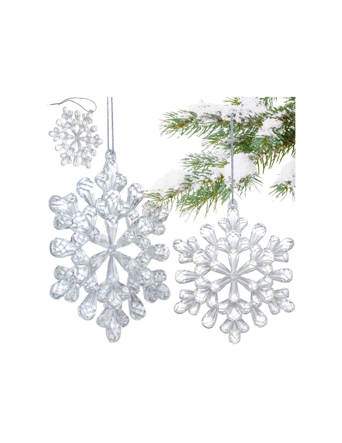 Dekoracyjne płątki śniegu wykonane sa z akrylu. Jest to jest solidny materiał, który nie pęka i nie traci przejrzystości. Możesz używać tych ozdób przez wiele sezonów bez obawy, że się zniszczą.